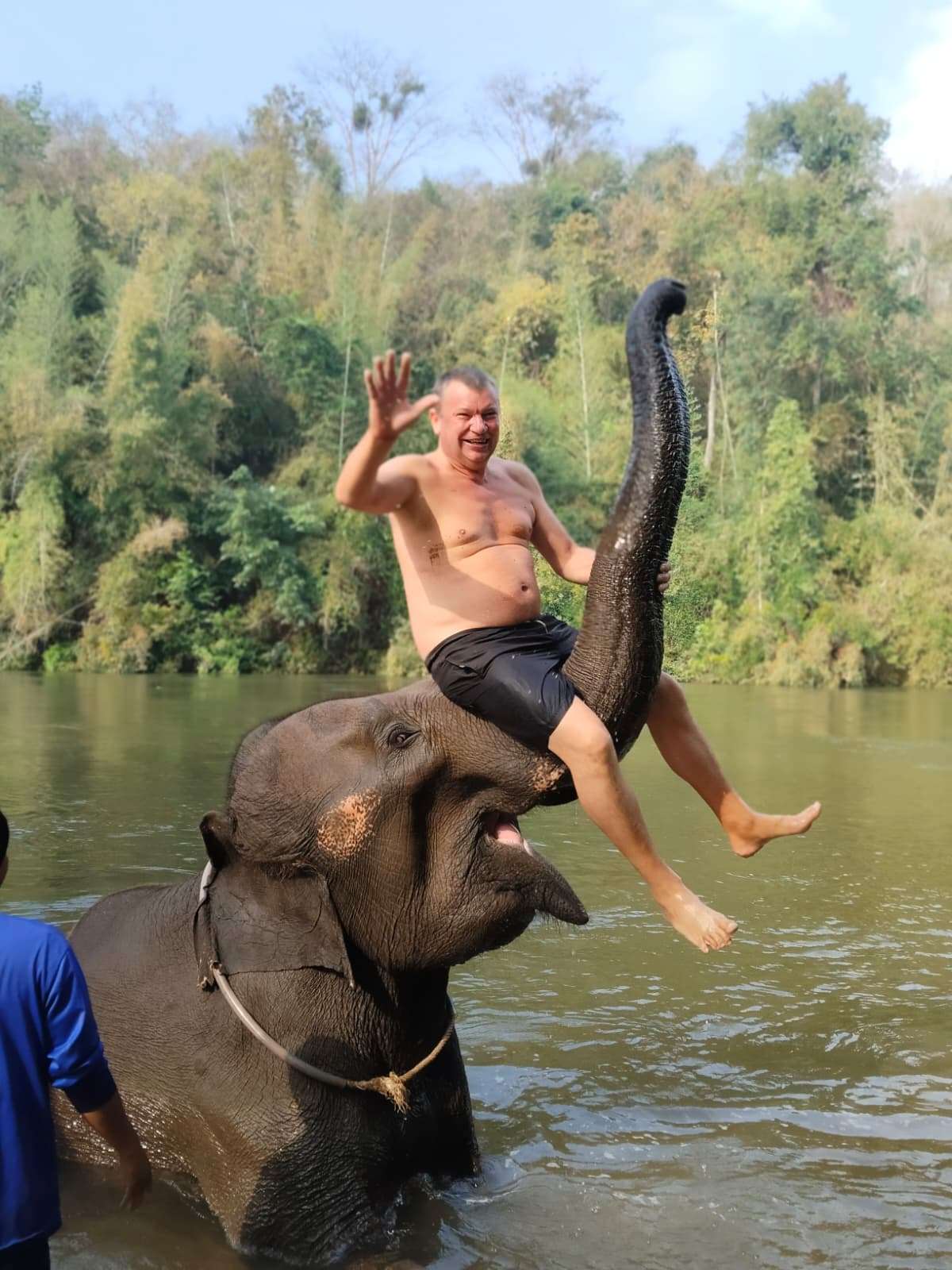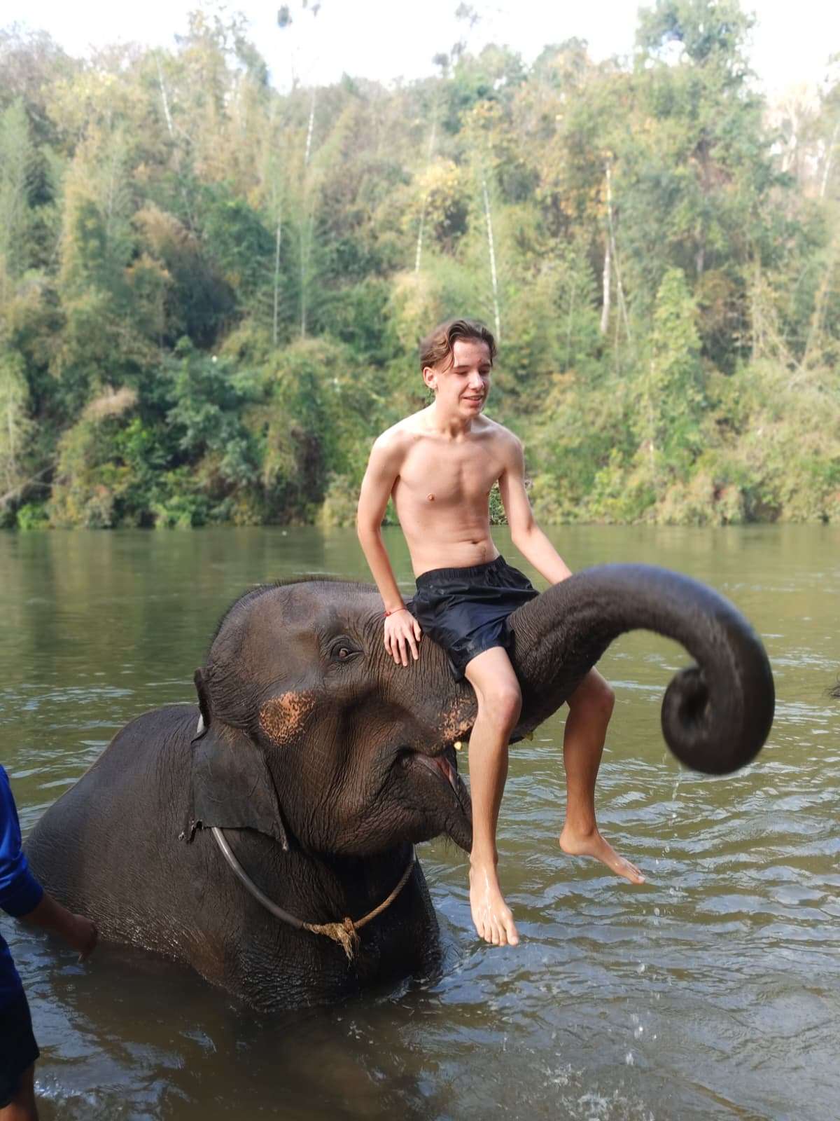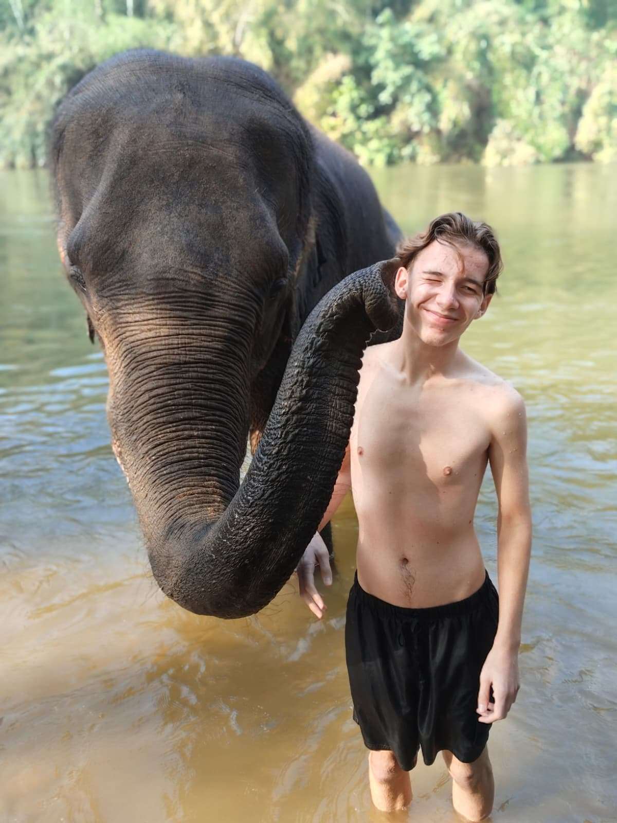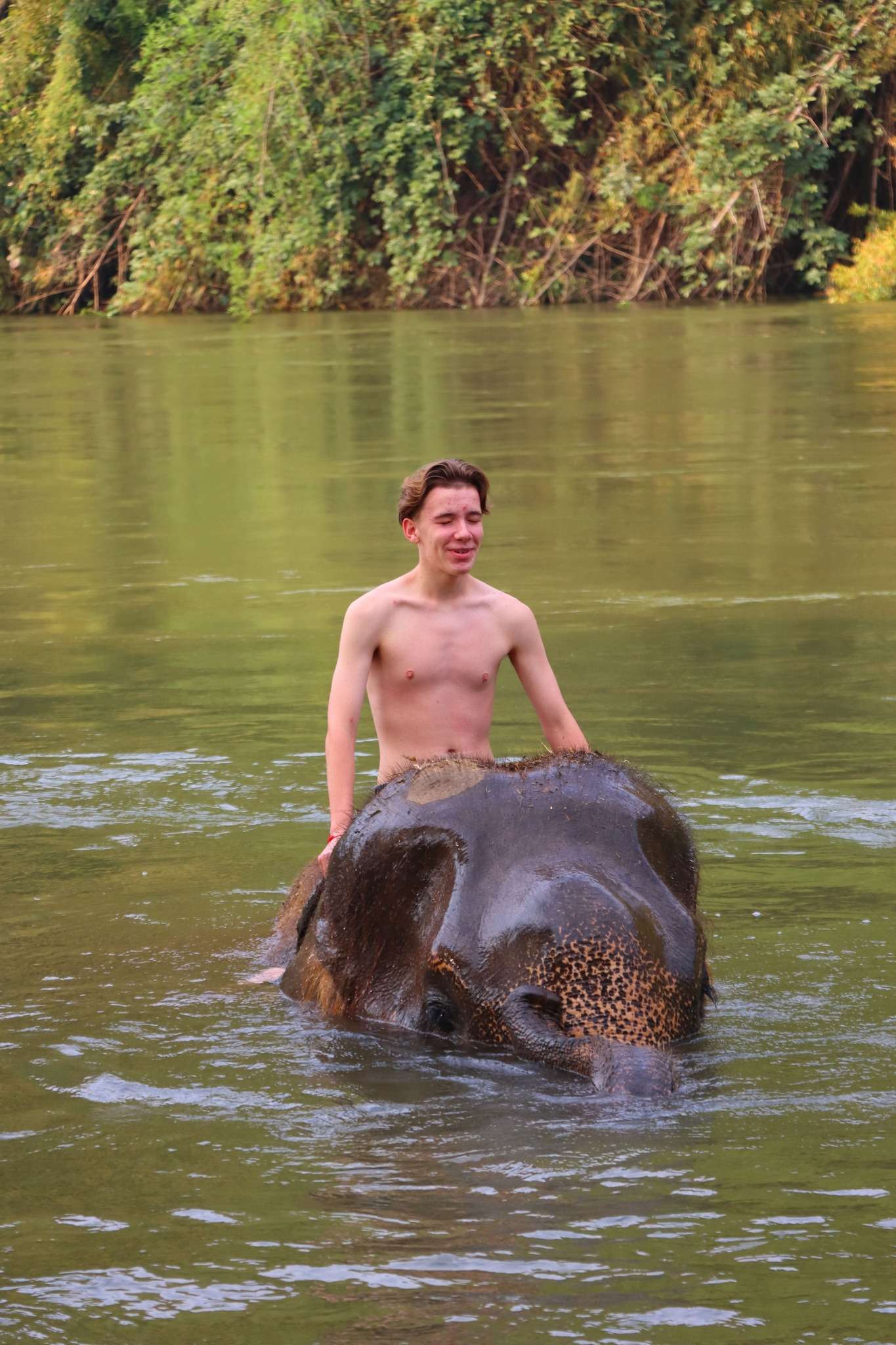 Bastien, complice de cette immersion, est monté sur Nook. Ensemble, ils entrent dans l’eau : l’homme perché sur l’éléphant, l’animal avançant avec assurance dans le courant. L’image est forte, non pas celle d’une domination, mais d’une confiance partagée.