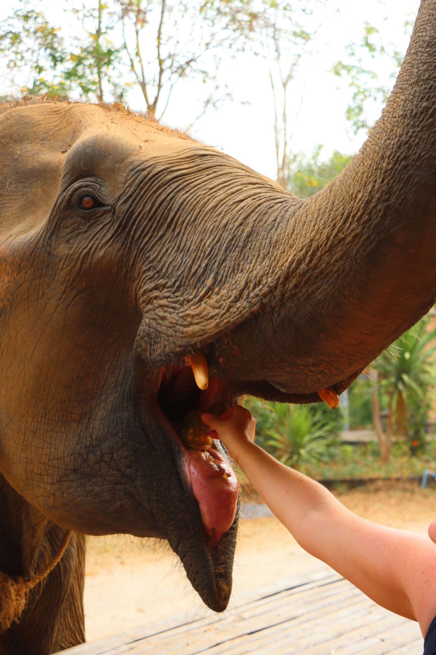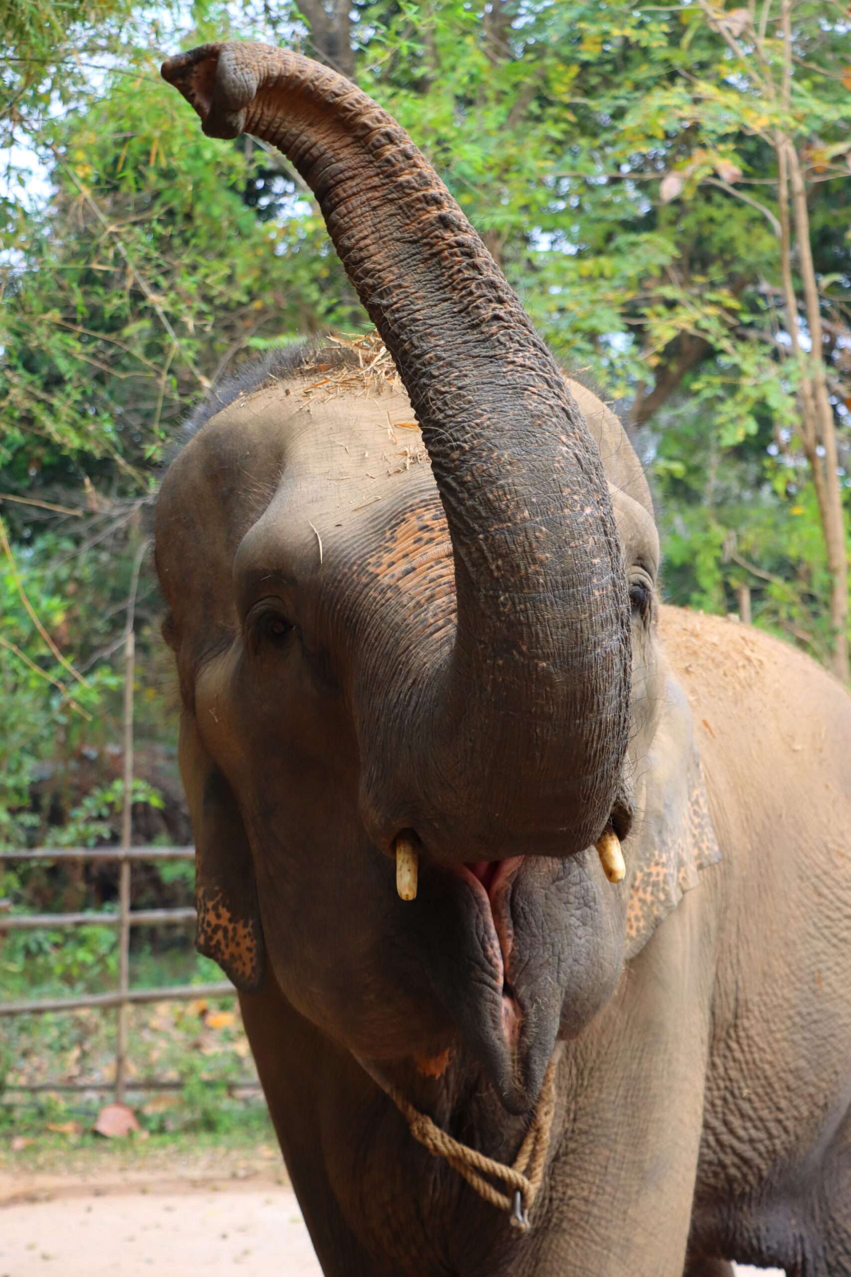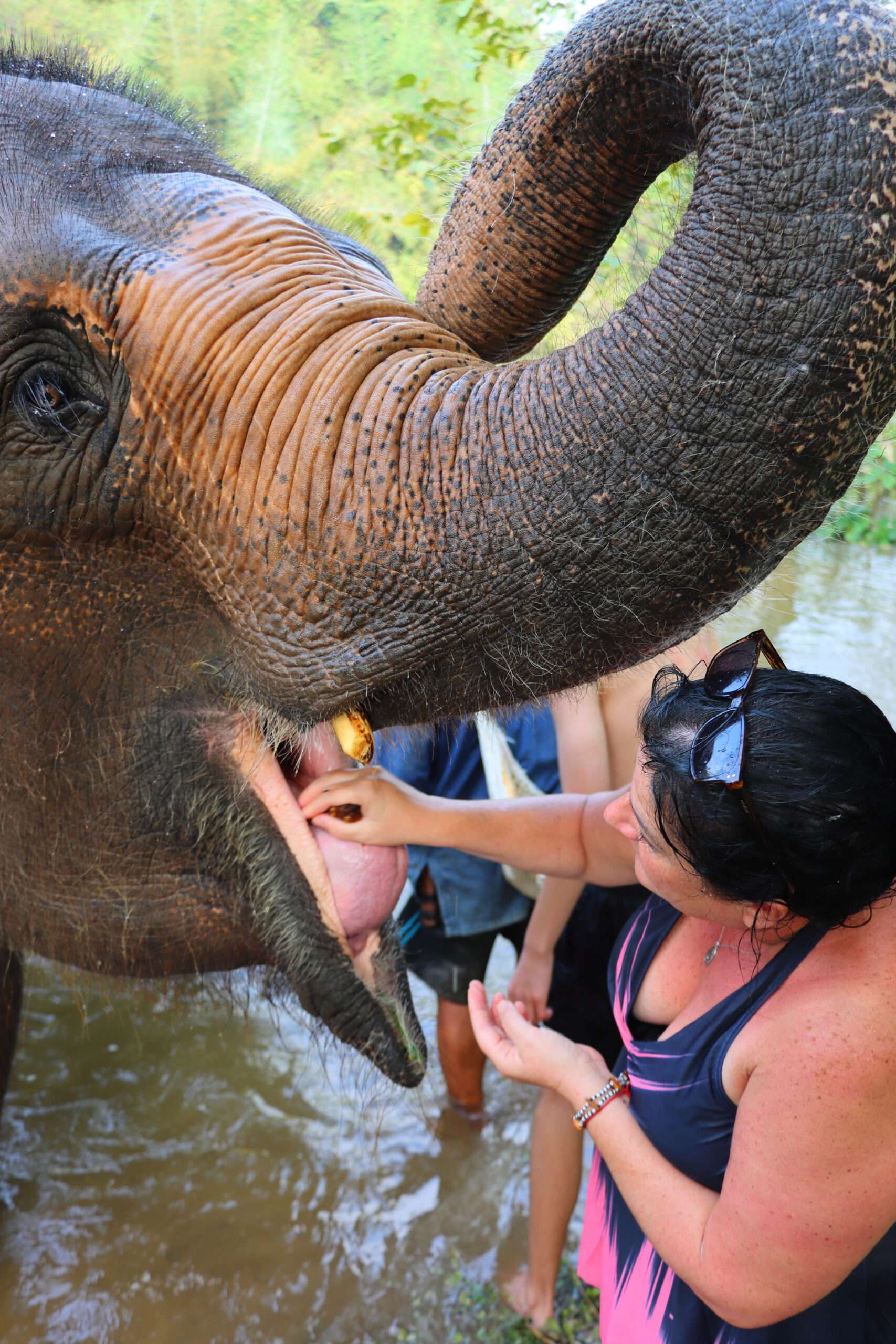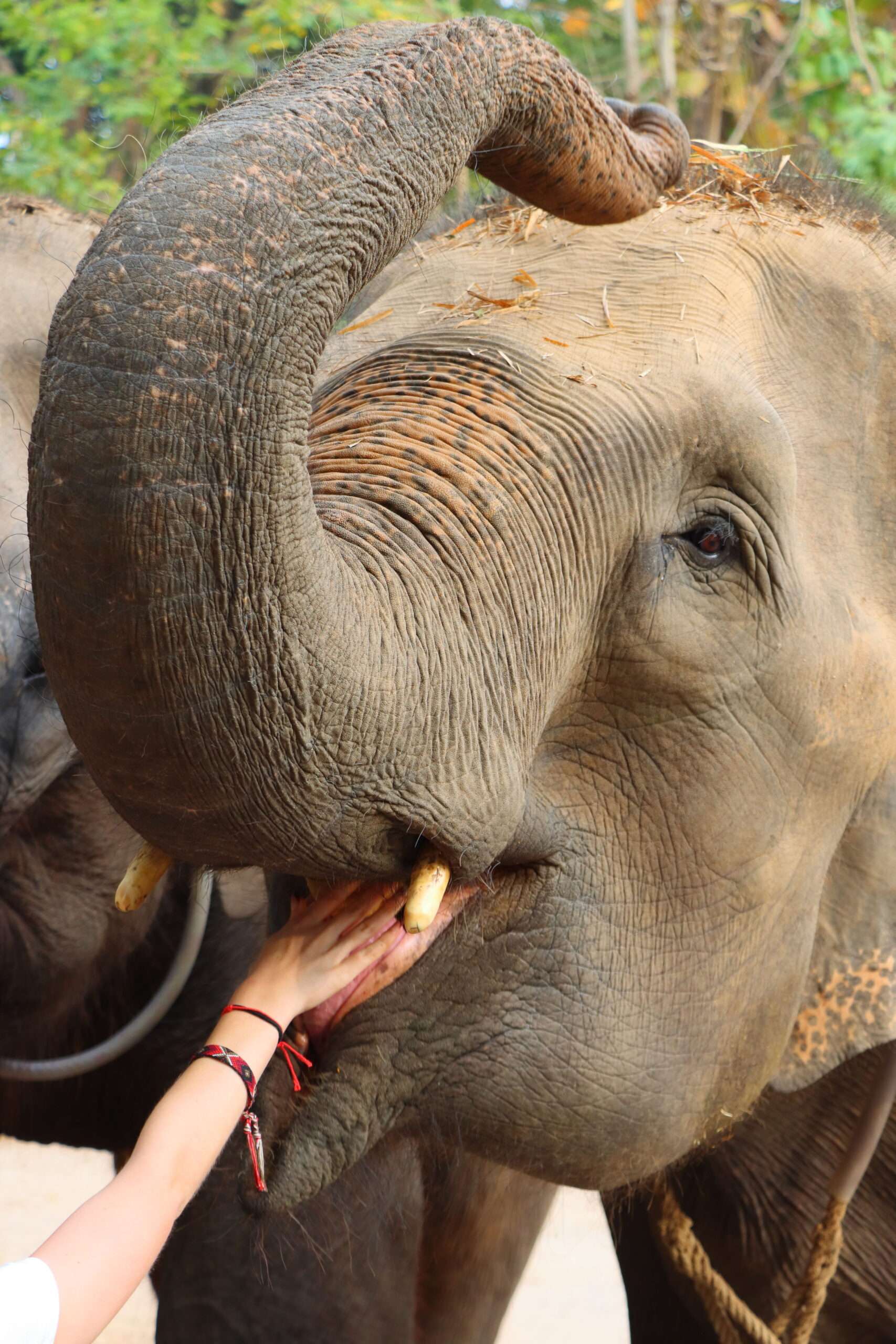Les éléphants s’approchent, lèvent la tête, et ouvrent grand la bouche. Leurs langues apparaissent, larges, rugueuses, prêtes à recevoir. Nous déposons les boulettes directement sur leur langue, parfois en glissant doucement la main entre leurs défenses. Le contact est plus intime que lors du premier nourrissage : ici, il n’y a plus de barrière, plus de table, plus de distance. Juste nous, eux, et cette confiance qui s’installe.