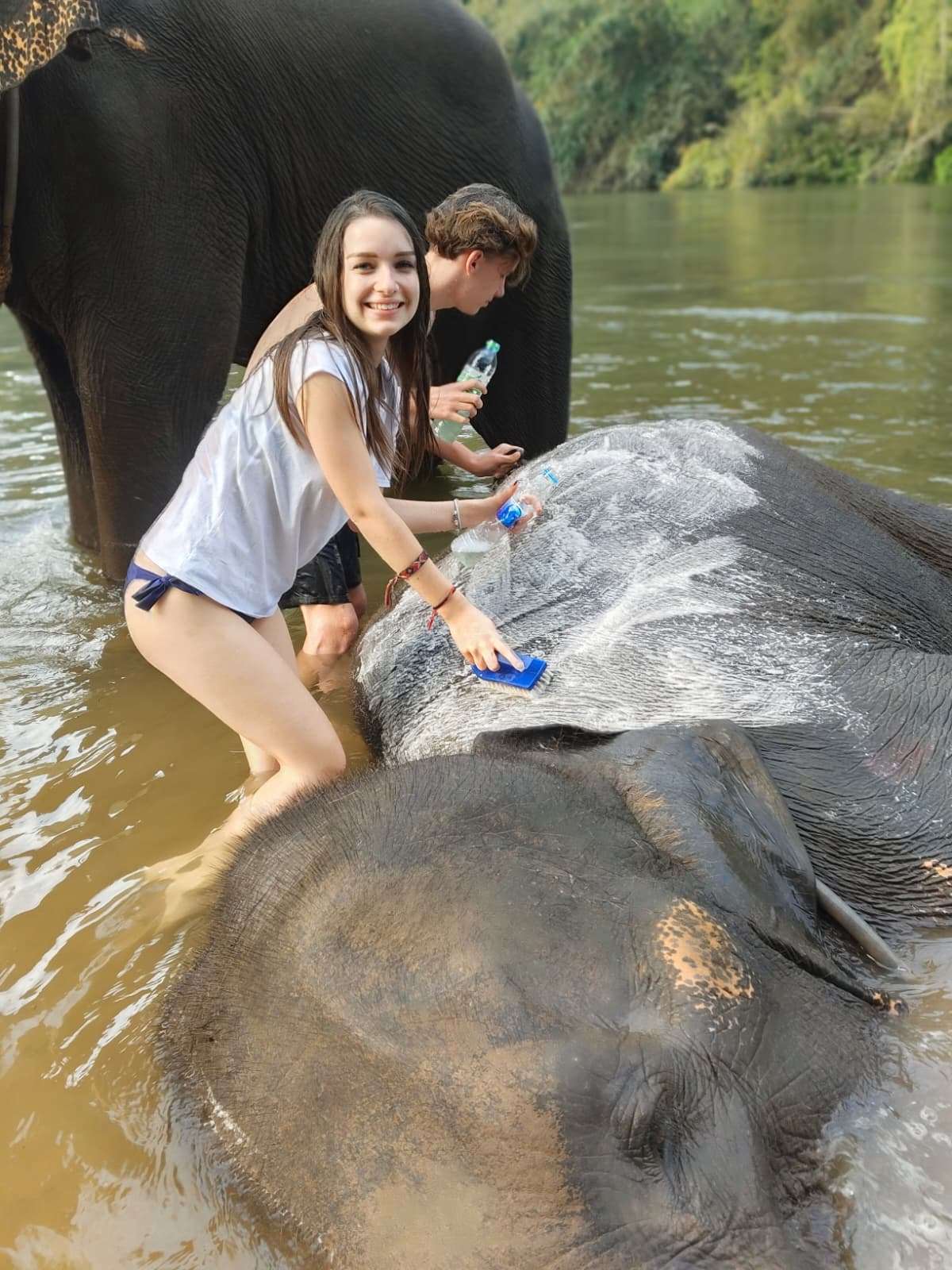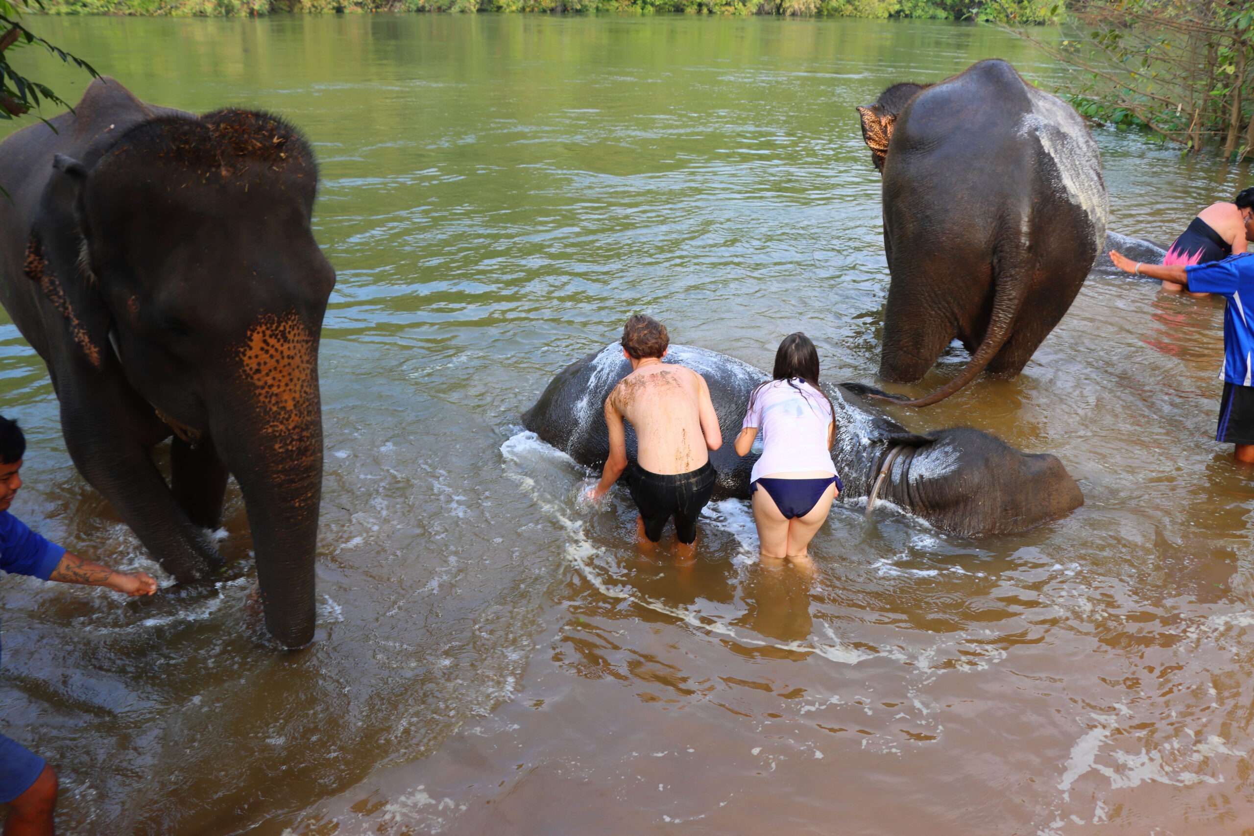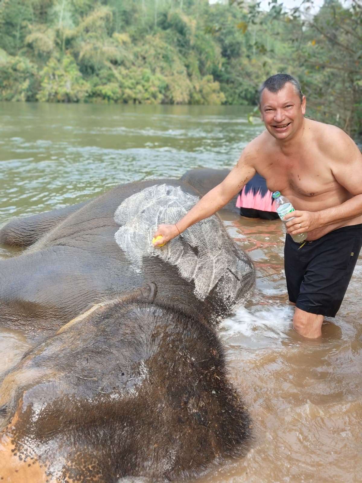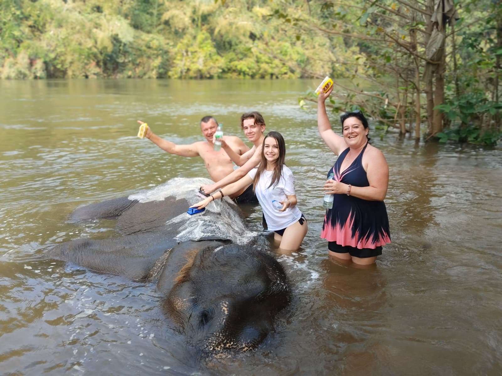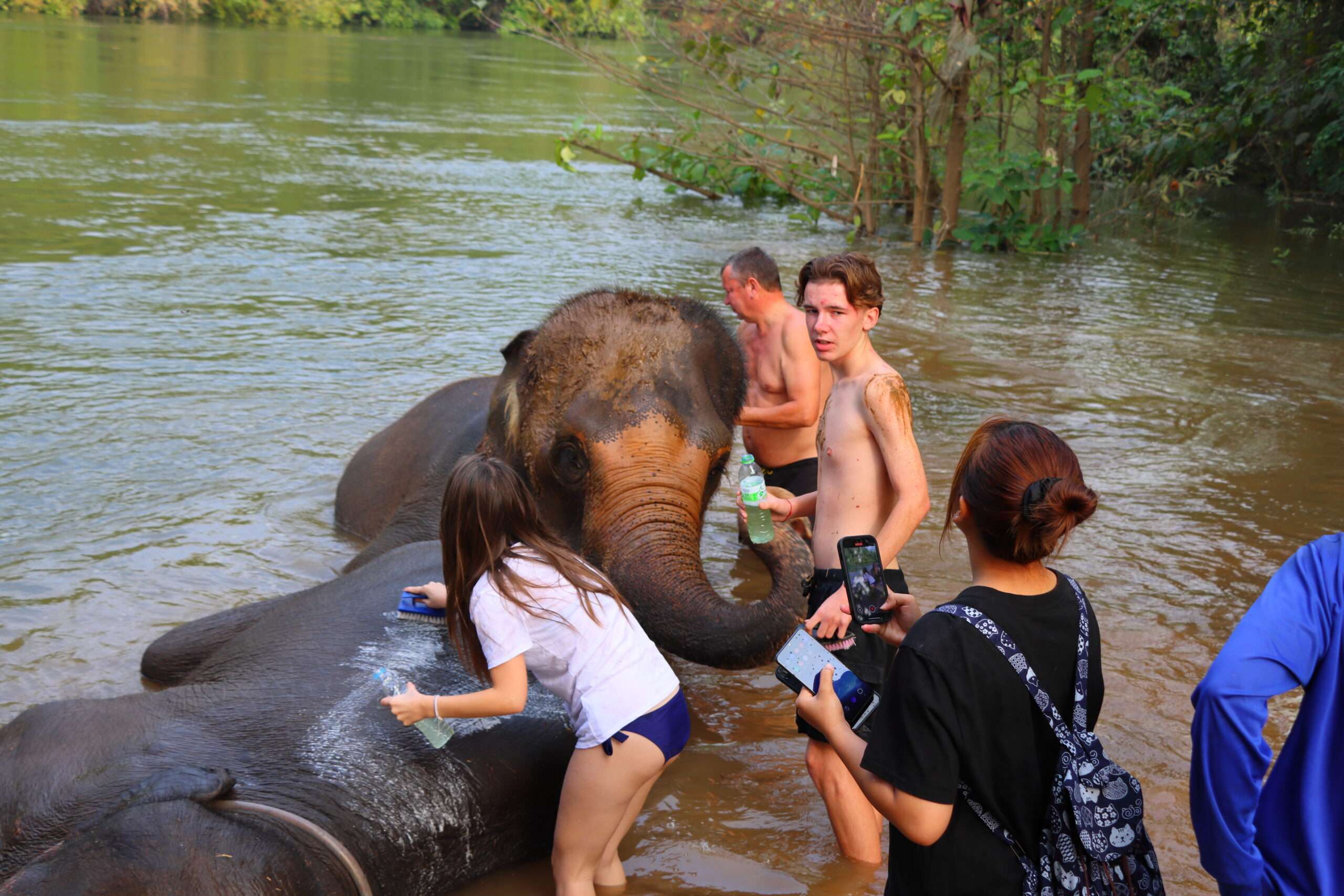 Puis vient l’étape du brossage. Après le bain de boue et les éclaboussures joyeuses, les soigneurs nous confient des brosses larges et souples. Nous les utilisons pour masser et nettoyer la peau des éléphants, encore humide de rivière. Leur corps massif se détend sous nos gestes : certains s’allongent dans l’eau, d’autres ferment les yeux, comme pour savourer cette caresse inattendue. Leurs respirations se ralentissent, leurs oreilles battent doucement, tout indique qu’ils apprécient ce moment.