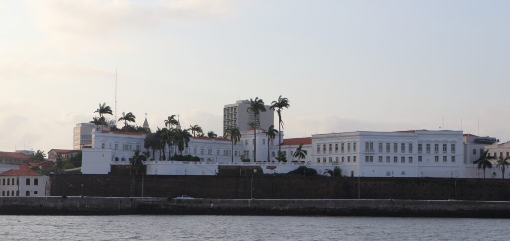 Le jour suivant notre arrivée à Sao Luis, nous embarquons sur le ferryboat reliant São Luís à Alcântara, pour une traversée d’environ une heure et demie à travers la Baía de São Marcos. Le voyage, bercé par le roulis des vagues et la lumière changeante du matin, nous offre des panoramas saisissants sur la ville, le port et les îles environnantes. À mesure que nous nous éloignons du quai, la silhouette de São Luís se dissout dans une brume légère, tandis qu’Alcântara se dessine peu à peu à l’horizon, entourée de plages dorées et de forêts luxuriantes.