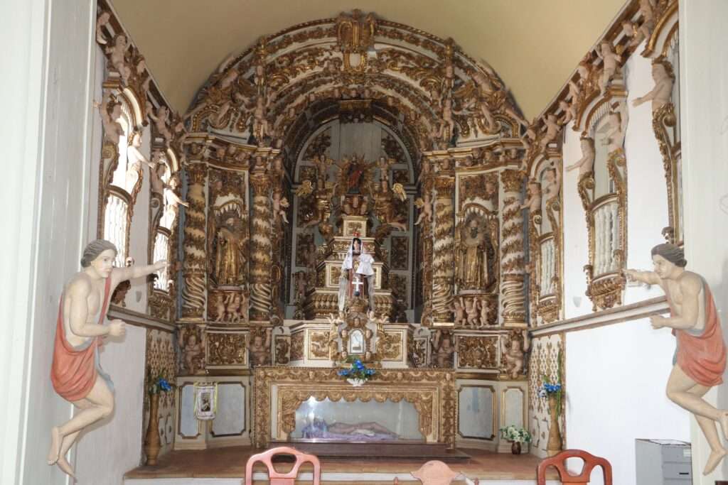 Ses colonnes torsadées, ses angelots, ses motifs floraux et ses volutes rococo composent un ensemble vibrant, presque théâtral, qui élève naturellement le regard vers le ciel. Les murs latéraux sont recouverts d’azulejos portugais, certains du type tapete, dont les motifs géométriques imitent des tapis orientaux. Importés de Lisbonne, ces carreaux témoignent du raffinement des élites d’Alcântara au XVIIIᵉ siècle et ajoutent une profondeur visuelle à l’espace sacré.