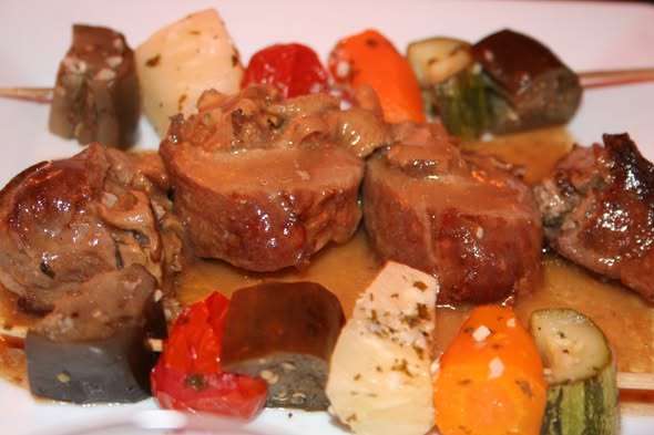 Très vite, les odeurs grillées envahissent l’air et nos assiettes deviennent des terrains d’exploration gastronomique. Les serveurs arrivent les uns après les autres, portant des broches fumantes qui brillent sous les lumières du restaurant. Nous goûtons au porc caramélisé à l’ananas, tendre et sucré juste ce qu’il faut, aux ribs fondants, à la côte d’agneau juteuse, à la poularde parfaitement rôtie, aux gésiers au caractère bien affirmé… Et puis viennent les curiosités, celles qui font hésiter, sourire, puis oser : zébu sous toutes ses formes, crocodile, sanglier, et même serpent. Chaque bouchée est une surprise, un mélange de découverte culinaire et de petit défi personnel.