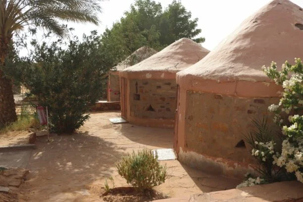 Nichée au cœur de l’oasis luxuriante de Terjit, l’auberge Chez Jamal propose une expérience d’hébergement authentique et rustique, loin de tout confort standardisé. Le campement, tenu par le vaillant Jamal, homme généreux et débrouillard, s’intègre parfaitement dans le paysage naturel, entre falaises ocres et palmeraie verdoyante.Les khaïmas traditionnelles, de tailles diverses, sont installées à même le sable. À l’intérieur, un simple matelas d’environ 5 cm posé sur une natte fait office de lit. Le confort est minimal, mais l’ambiance est magique : la tente laisse filtrer la brise du soir, les sons de la nature enveloppent doucement la nuit, et l’absence totale de Wi-Fi renforce le sentiment d’isolement total, au milieu d’un havre de paix.