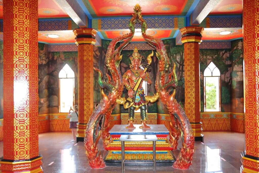 Nous garons notre véhicule au parking et réglons les droits d’entrée de 50 bahts pour la visite du Wat Tham Seua à Krabi. Avant même d’affronter les 1260 marches, nous prenons le temps de visiter le temple construit au pied de la muraille de pierre. L’ensemble architectural est un mélange de modernité et de tradition : statues dorées de Bouddha, pavillons aux toits effilés, colonnes décorées de motifs floraux et dragons protecteurs. Les fidèles viennent y déposer des offrandes, allumer des bâtons d’encens et prier dans une atmosphère où le quotidien se mêle au sacré. Les chants des moines résonnent parfois dans les galeries, donnant à ce lieu une intensité spirituelle qui contraste avec l’agitation du parking et des échoppes voisines.