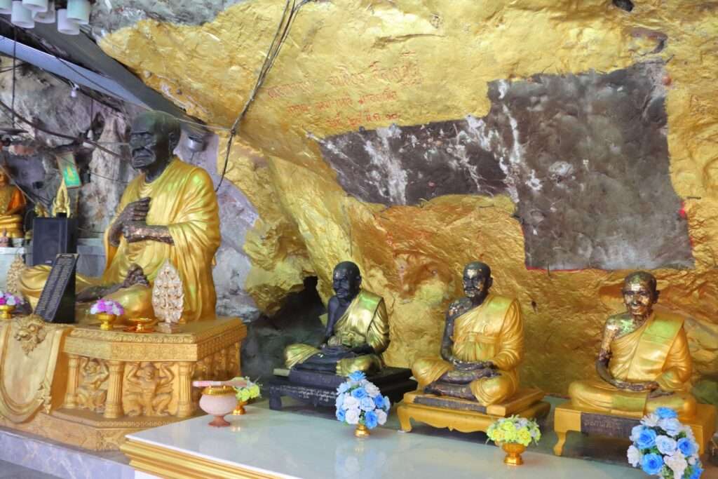 Puis nous suivons les flèches qui nous mènent aux escaliers, avec cette sensation d’entrée dans un lieu hors du temps. La chaleur de la plaine s’atténue à peine, la forêt se resserre autour du sentier et la roche calcaire, sculptée par des millénaires d’eau et de vent, devient écrin pour la dévotion. Les grottes, creusées et aménagées par des générations de pratiquants, alternent cavités fraîches et chapelles intimes où des autels sont disposés comme des haltes. Là, une statue du vénérable Achan Chamnien nous saisit par son réalisme et la ferveur qu’elle concentre ; ailleurs, des niches renferment des offrandes, des images de Bouddha polies par les mains des fidèles et des objets rituels qui racontent la continuité d’une pratique monastique ancrée dans le lieu.