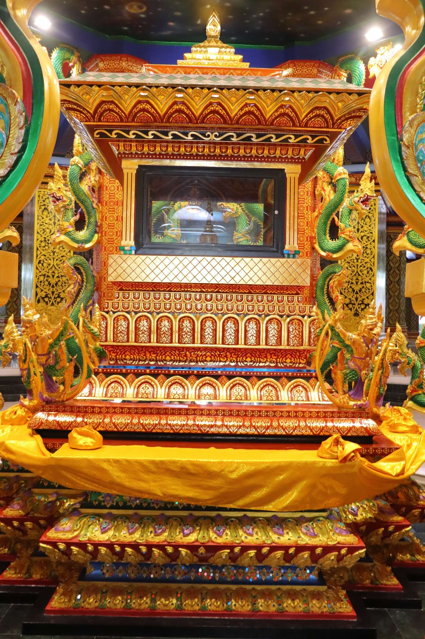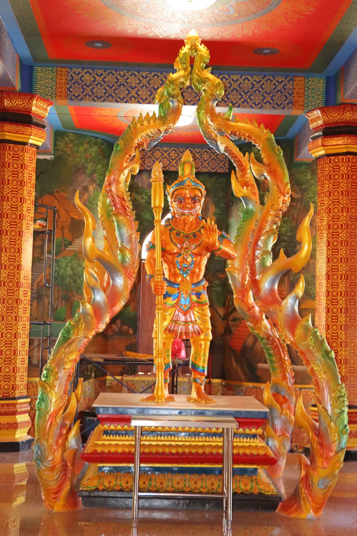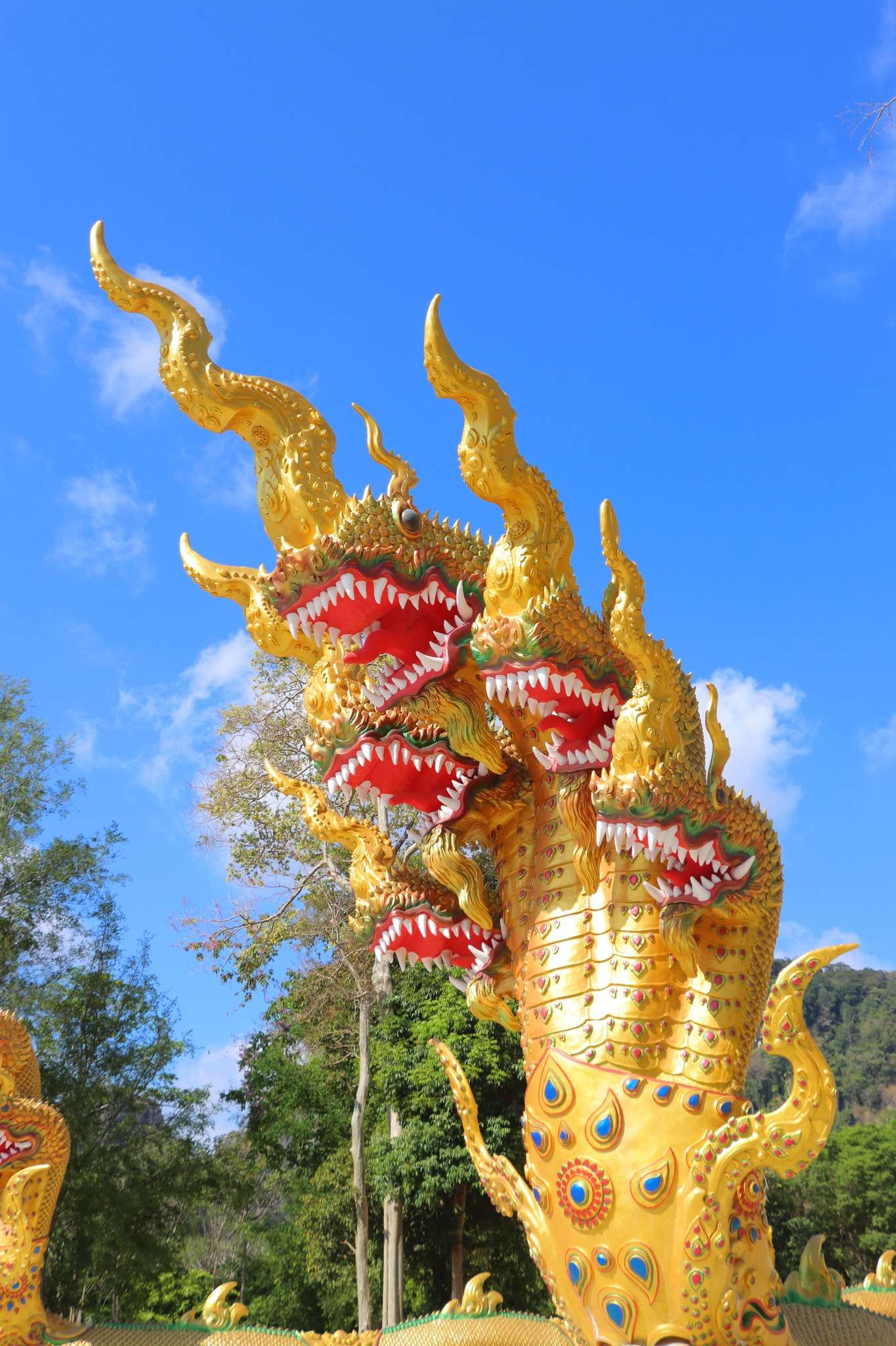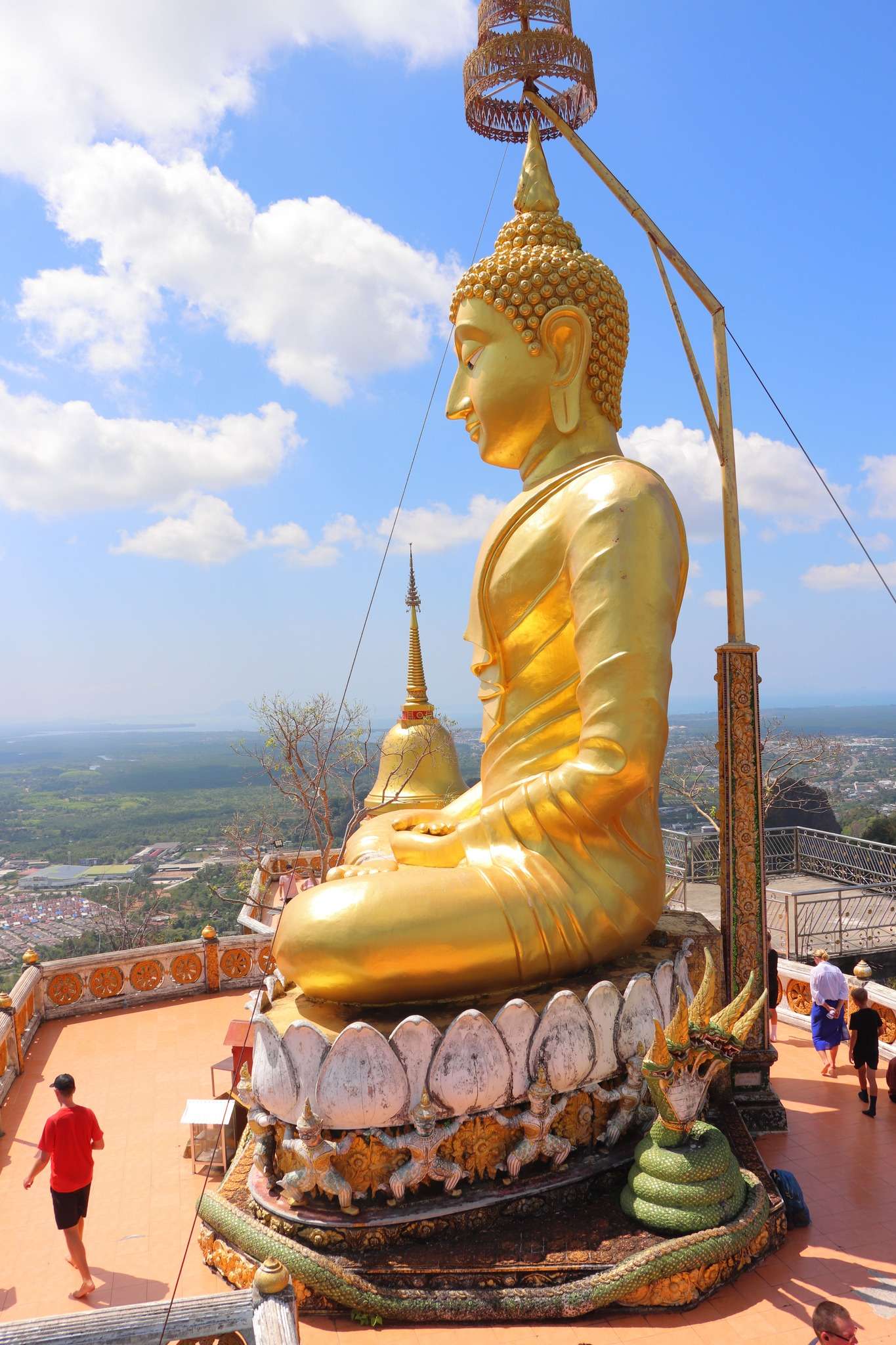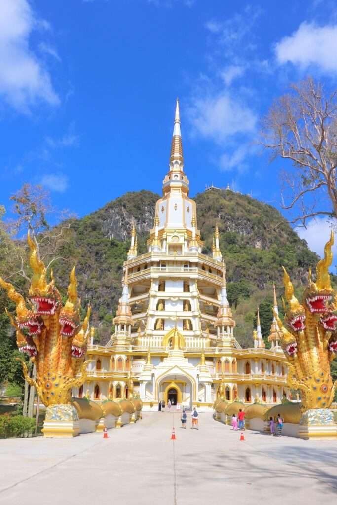 Nous garons notre véhicule au parking et réglons les droits d’entrée de 50 bahts pour la visite du Wat Tham Seua à Krabi. Avant même d’affronter les 1260 marches, nous prenons le temps de visiter le temple construit au pied de la muraille de pierre. L’ensemble architectural est un mélange de modernité et de tradition : statues dorées de Bouddha, pavillons aux toits effilés, colonnes décorées de motifs floraux et dragons protecteurs. Les fidèles viennent y déposer des offrandes, allumer des bâtons d’encens et prier dans une atmosphère où le quotidien se mêle au sacré. Les chants des moines résonnent parfois dans les galeries, donnant à ce lieu une intensité spirituelle qui contraste avec l’agitation du parking et des échoppes voisines.