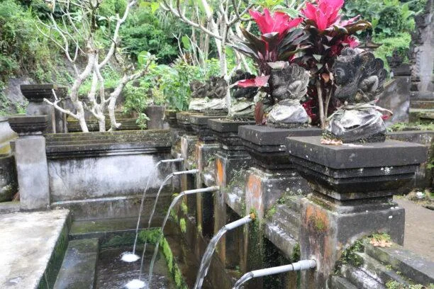 Ce qui rend ce temple si particulier, c’est sa disposition ingénieuse des lieux de purification. La piscine réservée aux femmes, séparée de celle des hommes, possède ses propres becs purificateurs et même une chute d’eau naturelle qui vient ajouter au rituel de nettoyage. Dans la piscine des hommes, nous avons fait une brève halte pour observer de près la cascade, un point culminant du processus de purification, où les fidèles se tiennent sous l’eau en signe de renouveau et de purification ultime. Ce moment, à la fois solennel et empreint d’une énergie vivifiante, nous a laissé un souvenir inoubliable.