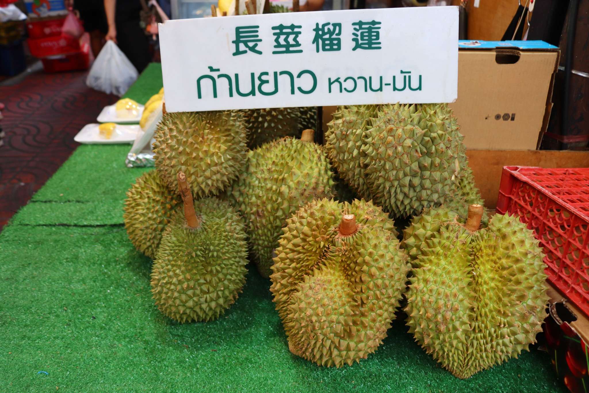 Les desserts ne sont pas en reste. Des fruits tropicaux, entiers ou découpés, sont présentés comme des bijoux : mangues dorées, dragon fruits éclatants, mangoustans violets, longanes translucides. À côté, de petites douceurs miniatures, brillantes, façonnées comme des fruits miniatures, attirent les enfants comme les adultes.