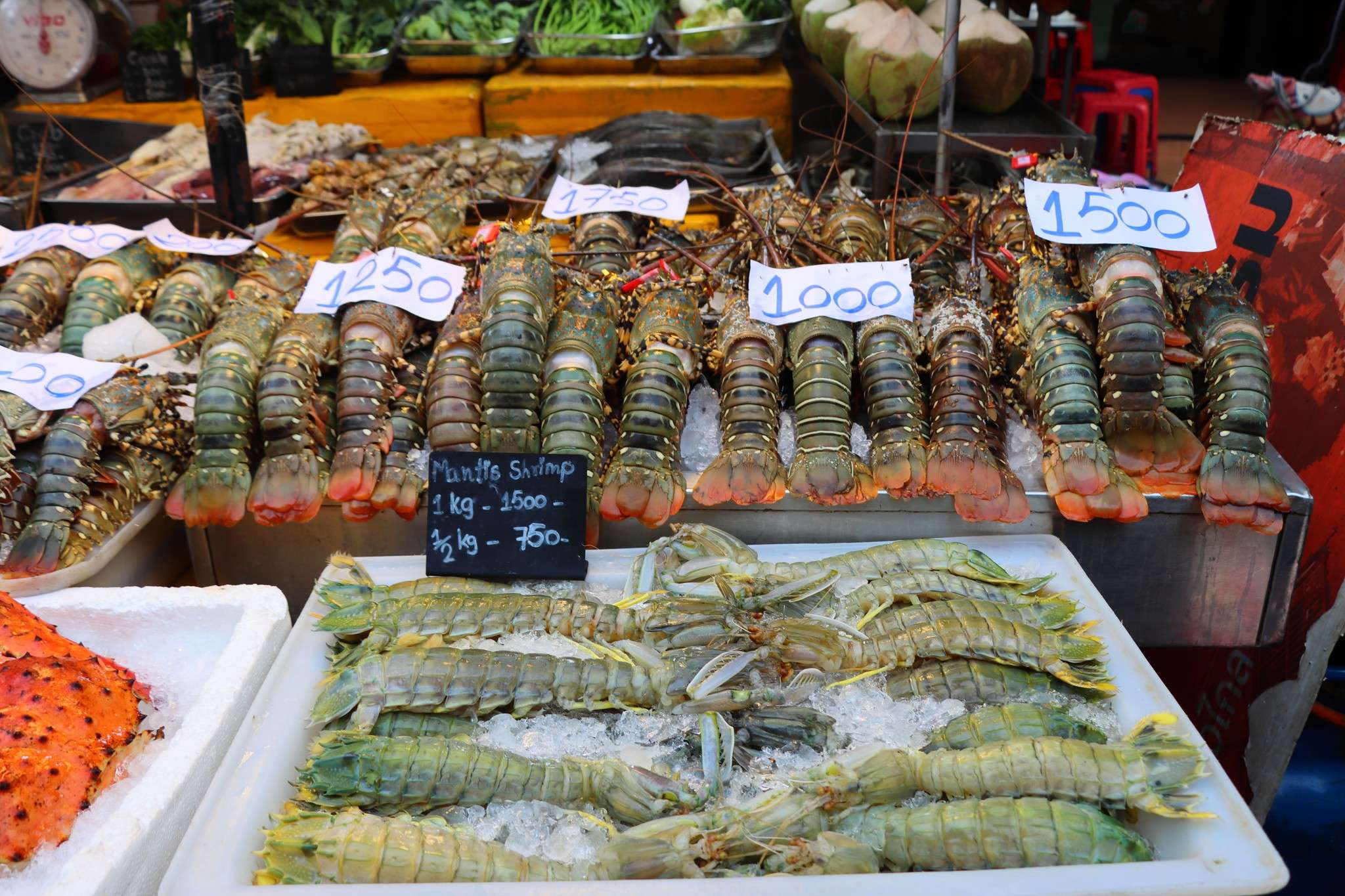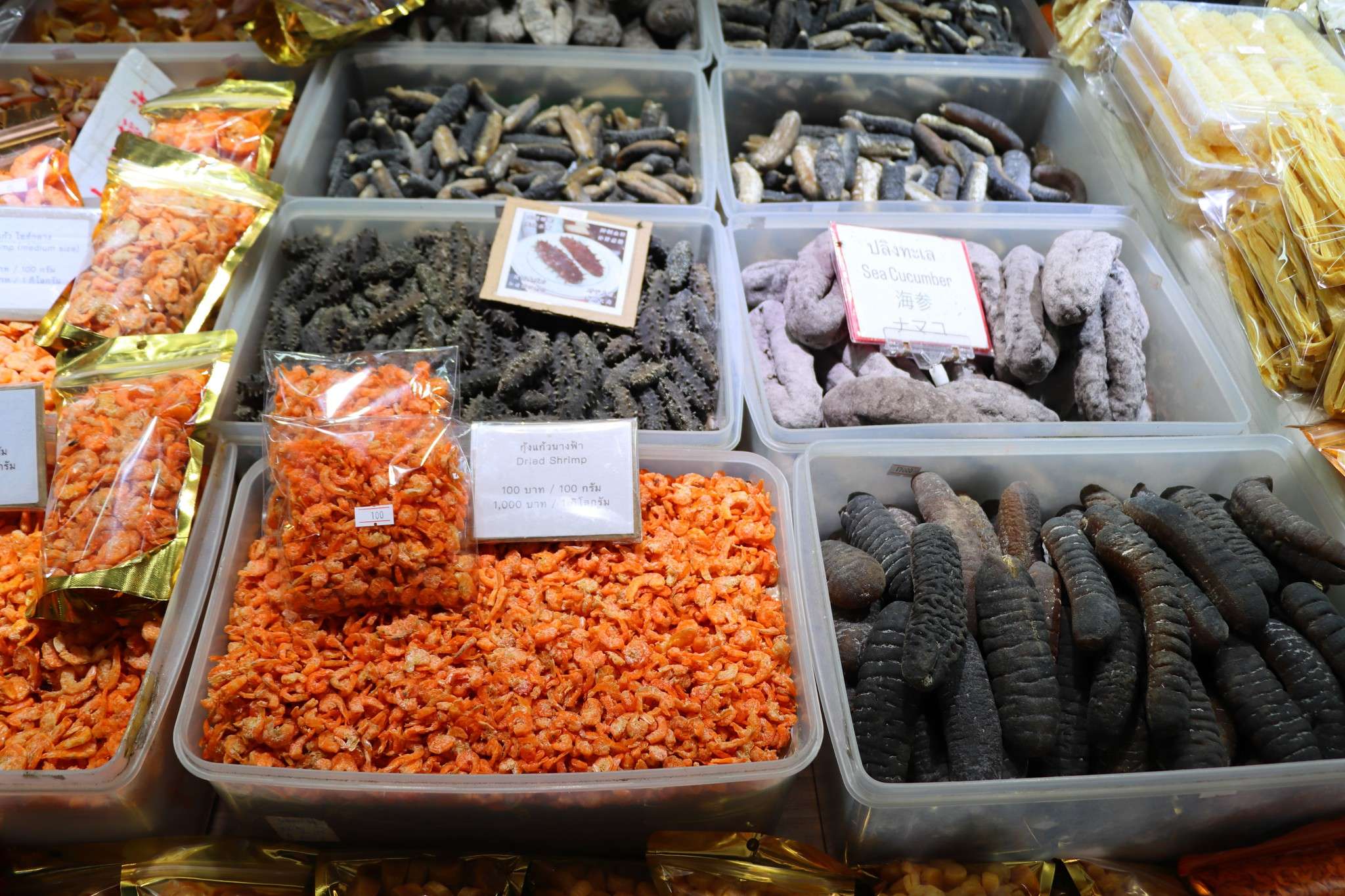 Les fruits de mer frais abondent : crabes ouverts sur glace, queues de homard, mantis shrimp aux reflets nacrés. Les étals brillent sous les lampes, et l’air est saturé d’embruns et de sel. Nous tombons aussi sur des concombres de mer, ces créatures marines séchées, noires ou grises, vendues en vrac dans des bacs. Leur aspect rugueux et étrange contraste avec leur valeur gastronomique et médicinale : dans la cuisine chinoise, ils sont réputés pour leurs vertus nutritives et leur texture unique, servie dans des soupes ou des plats de fête.