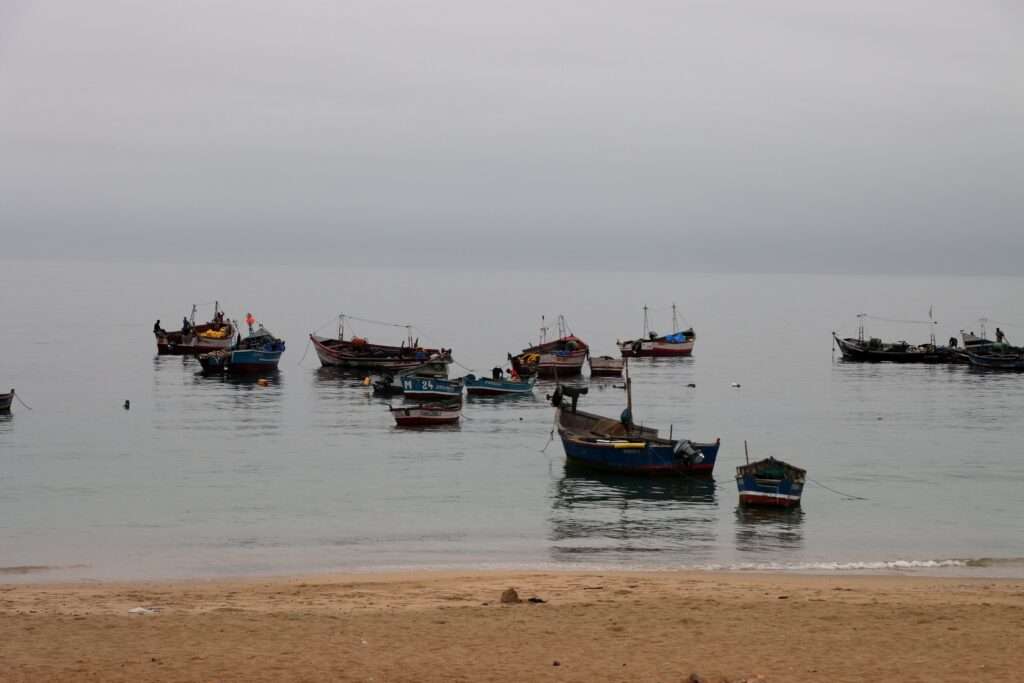 À l’approche de Lucira, un monument insolite annonce l’entrée dans le bourg : une barque stylisée sur des vagues bleues, un poisson suspendu à une canne, et une date — 13 mai 1842. Cette date marque la fondation du petit port par les colons portugais, alors que la région servait de relai maritime entre Benguela et Namibe. Nous sommes arrivés dans une crique naturelle aux eaux calmes, abritée par les collines.