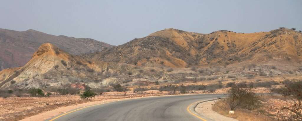 Nous quittons Benguela à l’aube, laissant derrière nous la douceur du littoral pour rejoindre les reliefs du sud. Le soleil rase encore les collines, mais déjà, les strates colorées se réveillent : rouges ferrugineux, jaunes ocres, gris manganèse, presque violets par endroits. La route, d’abord asphaltée, s’élève lentement à travers un paysage d’une richesse géologique fascinante. Ces couches de sédiments, plissées par des millions d’années de mouvements tectoniques, appartiennent au socle précambrien du bouclier angolais, entaillé ici par l’érosion et la déflation éolienne.