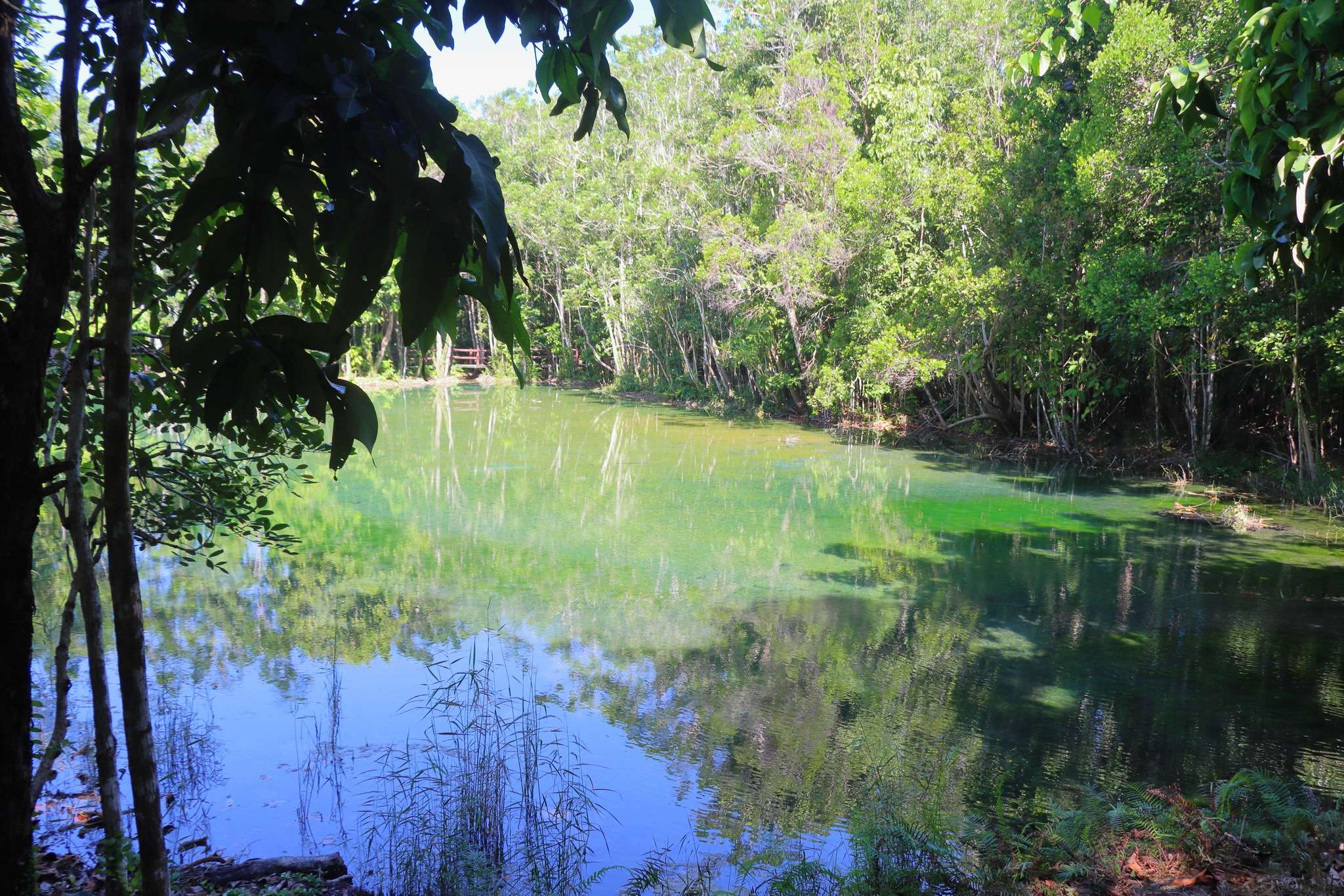 Puis soudain, la couleur apparaît. L’Emerald Pool se dévoile : un bassin circulaire d’environ 20 mètres de diamètre, d’un vert intense et lumineux. L’eau est claire, légèrement laiteuse, et semble éclairée de l’intérieur. Cette teinte particulière provient des dépôts minéraux calcaires et de la pureté exceptionnelle de la source. L’eau provient d’une résurgence naturelle filtrée par les roches souterraines, ce qui explique sa transparence et sa température agréable (environ 30°C). Située à 100 mètres au‑dessus du niveau de la mer, elle s’est formée grâce à l’eau de source et aux roches jaillissant de la colline. Le carbonate de calcium (CaCO₃), issu de l’altération chimique, se dépose sur le sol et forme des « cascades de calcium » figées, véritables sculptures naturelles. Ce phénomène de précipitation minérale crée des travertins, qui donnent au site son caractère géologique unique