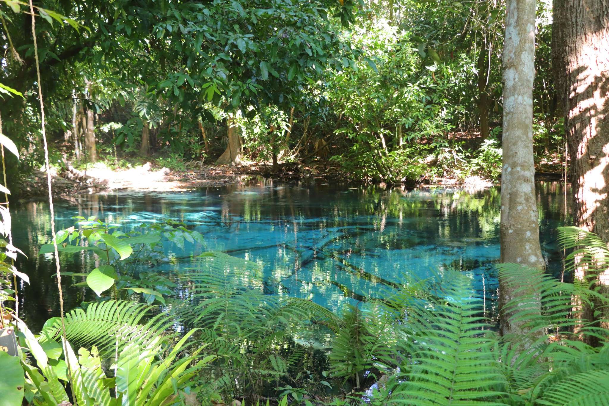Il faut quitter la mer pour comprendre pleinement Krabi. S’éloigner des longtails et des falaises calcaires, prendre la route vers l’intérieur des terres, traverser plantations d’hévéas et collines couvertes de jungle. Après environ 1h15 de route depuis Ao Nang, on atteint le district de Khlong Thom, au sud de la province. C’est là, dans la réserve naturelle de Khao Phra Bang Khram, que se cachent deux bassins spectaculaires : l’Emerald Pool — Sa Morakot en thaï — et, peut‑être encore plus mystérieuse, la Blue Pool.