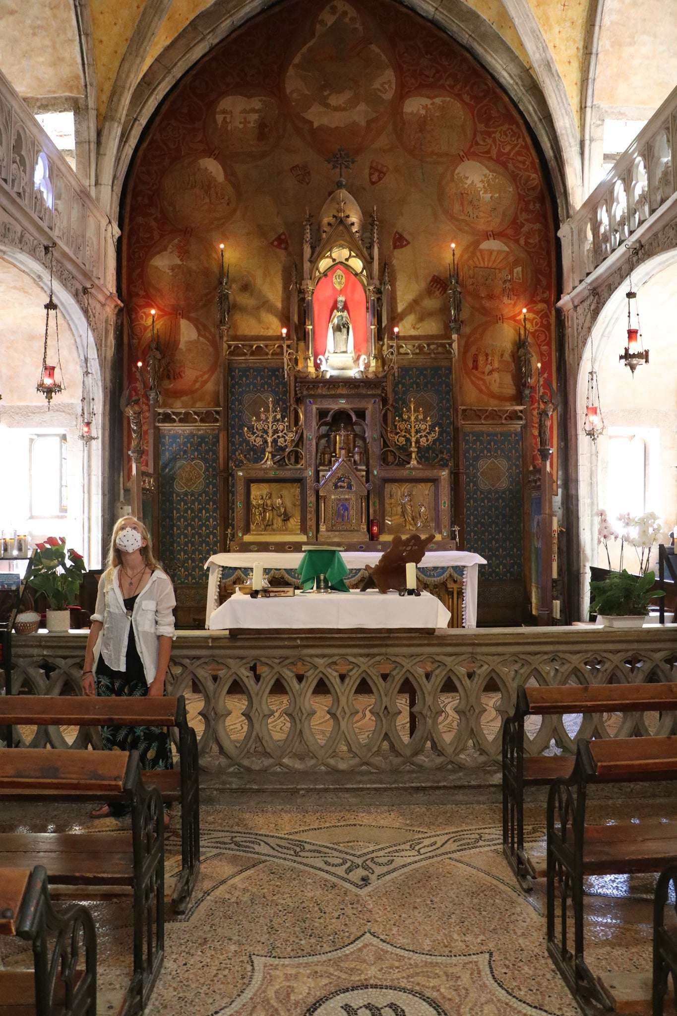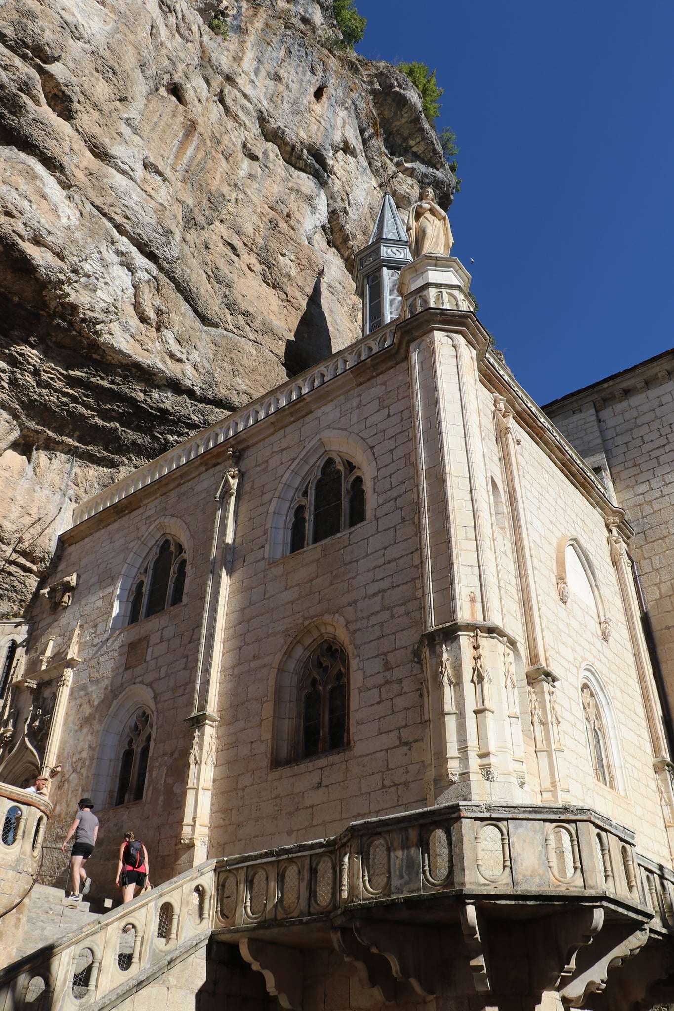 Les sept chapelles du sanctuaire s’imbriquent dans la falaise comme les cellules d’un organisme sacré. Chacune possède son identité : chapelle Saint‑Michel, adossée directement à la paroi rocheuse ; chapelle Saint‑Jean‑Baptiste, ornée de fresques gothiques ; chapelle Saint‑Blaise, dédiée aux guérisons. Les voûtes, les vitraux, les autels sculptés composent un ensemble architectural d’une rare cohérence malgré les siècles et les styles superposés.