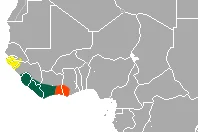 Répartition du colobe bai de Temminck (en jaune), colobe bai d’Afrique occidentale (en vert) et de Piliocolobus badius waldronae (en rouge)