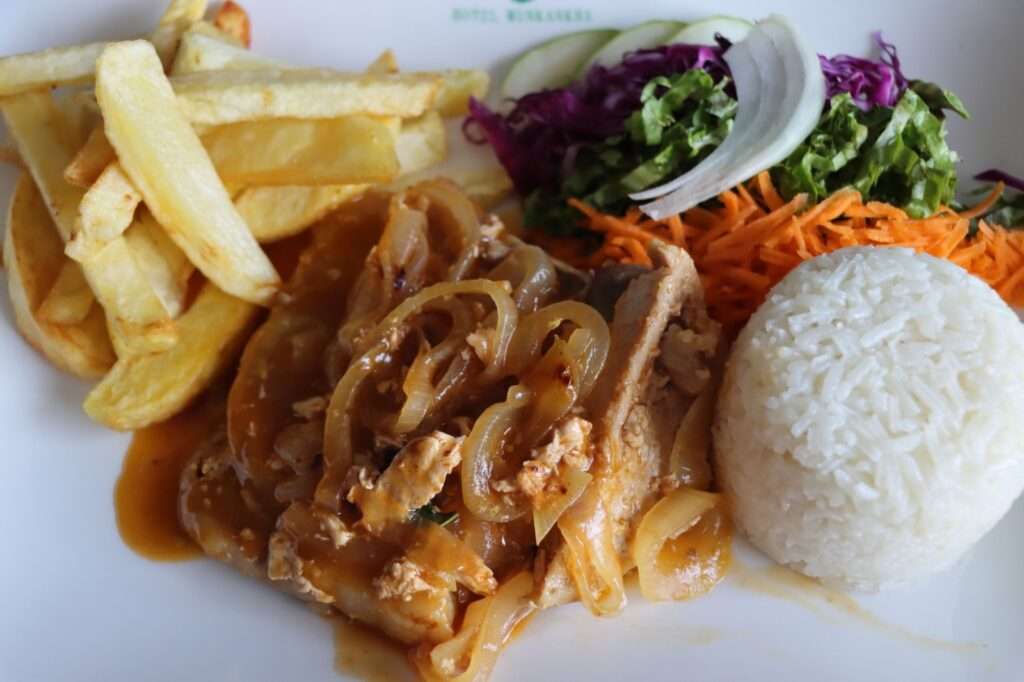 La carte, déjà bien succincte – à peine cinq plats – ne laisse guère de place à la surprise. Nous optons pour les bitoques et un bifana, espérant retrouver un peu de saveur portugaise sous le soleil du Cunene. Hélas, les assiettes arrivent tièdes, la viande sèche, le porc un peu coriace. Rien de dramatique, mais rien non plus qui fasse battre le cœur.