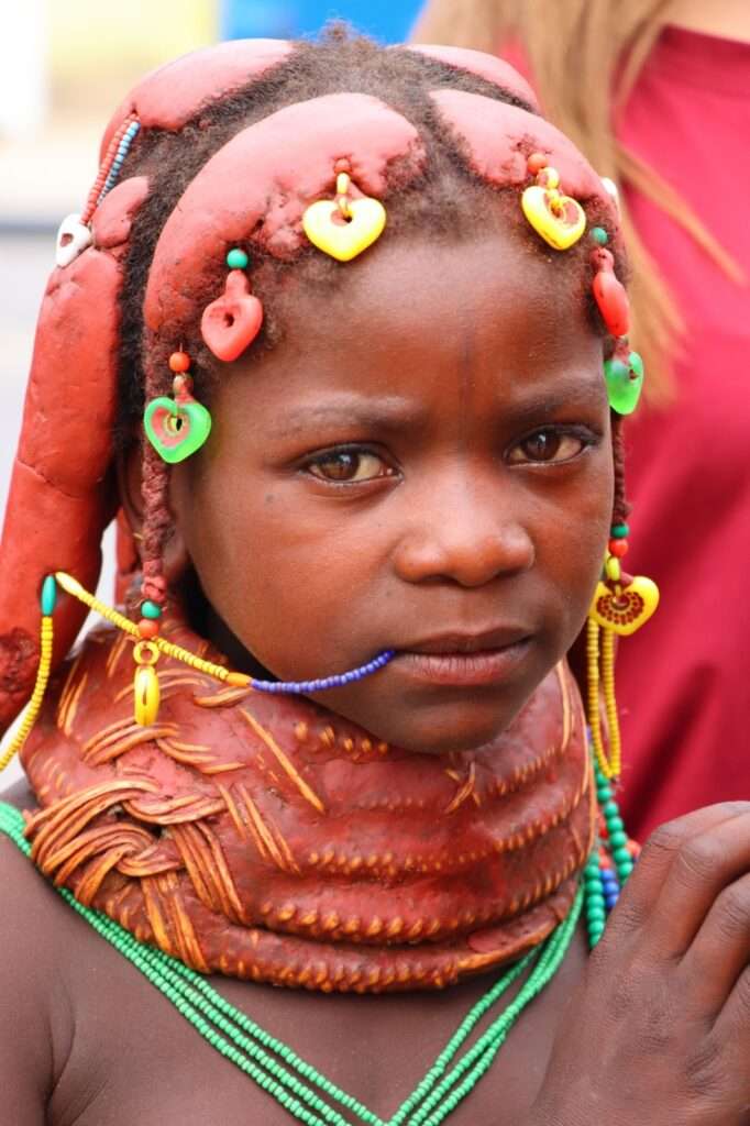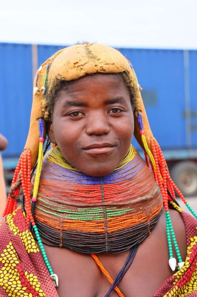 Chez les Cuanhama, le corps est un espace d’expression identitaire. Les jeunes filles portent des coiffures enduites d’ocre rouge, mêlée de beurre et de cendres : une pâte protectrice qui nourrit les cheveux et sculpte la silhouette. Cette parure, transmise de mère en fille, marque l’entrée dans l’âge nubile.