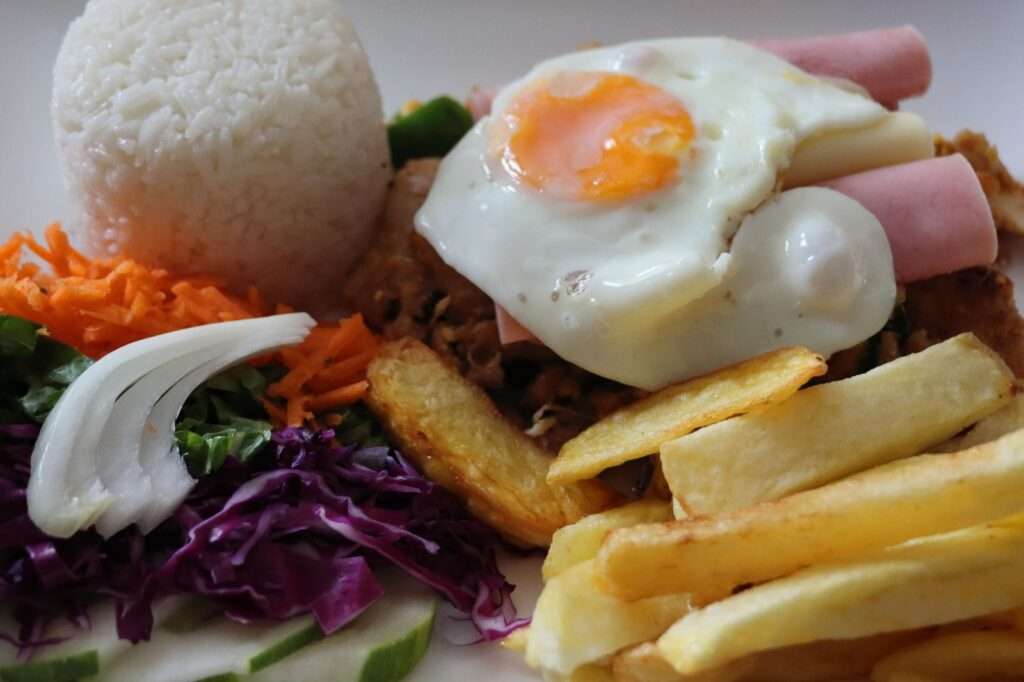 La carte, déjà bien succincte – à peine cinq plats – ne laisse guère de place à la surprise. Nous optons pour les bitoques et un bifana, espérant retrouver un peu de saveur portugaise sous le soleil du Cunene. Hélas, les assiettes arrivent tièdes, la viande sèche, le porc un peu coriace. Rien de dramatique, mais rien non plus qui fasse battre le cœur.