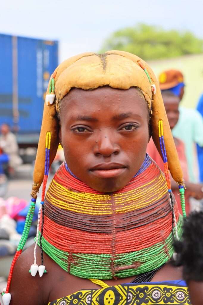 Chez les Cuanhama, le corps est un espace d’expression identitaire. Les jeunes filles portent des coiffures enduites d’ocre rouge, mêlée de beurre et de cendres : une pâte protectrice qui nourrit les cheveux et sculpte la silhouette. Cette parure, transmise de mère en fille, marque l’entrée dans l’âge nubile.