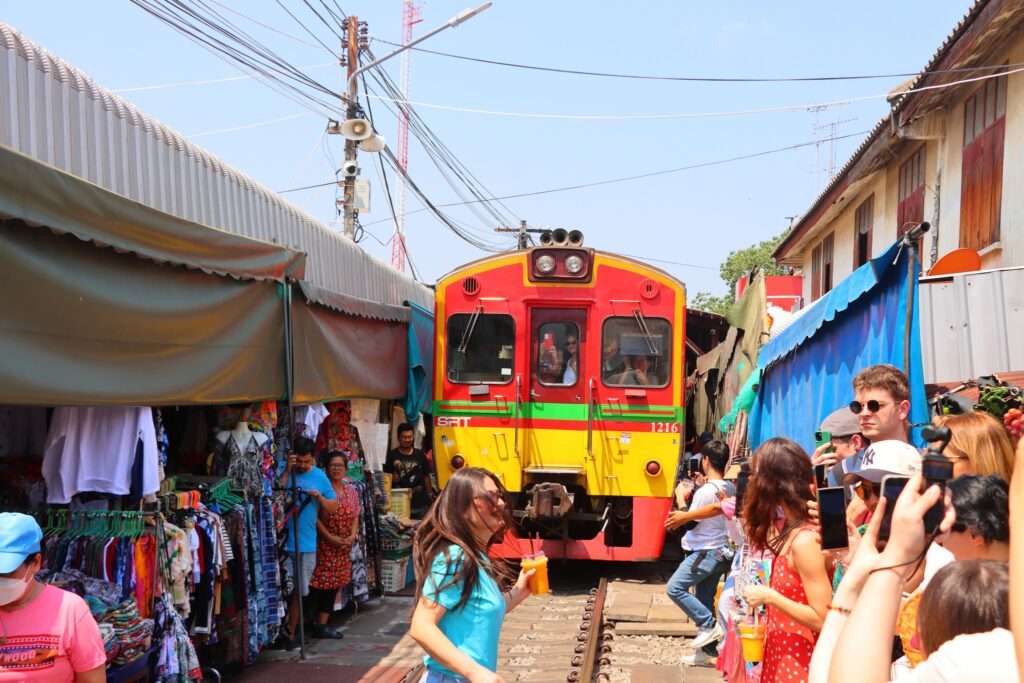 Nous arrivons dans une rue qui semble être un marché comme tant d’autres en Thaïlande : étals colorés, fruits tropicaux, vêtements suspendus, odeurs d’épices et de cuisine de rue. Les vendeurs discutent avec les clients, les touristes circulent entre les stands, et les rails passent simplement… au milieu de tout cela.