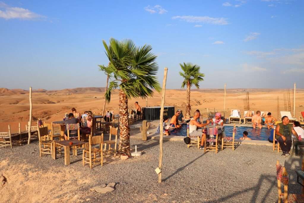 Dès notre arrivée, nous avons ressenti la quiétude propre à cet endroit. Loin du tumulte de Marrakech, le silence du désert n’était interrompu que par le souffle du vent. Nous avons choisi de débuter notre journée par une balade à dos de chameau, une expérience incontournable pour s’immerger dans l’ambiance du désert. Chevaucher ces animaux majestueux, tout en admirant les ondulations du paysage autour de nous, était aussi apaisant qu’impressionnant.