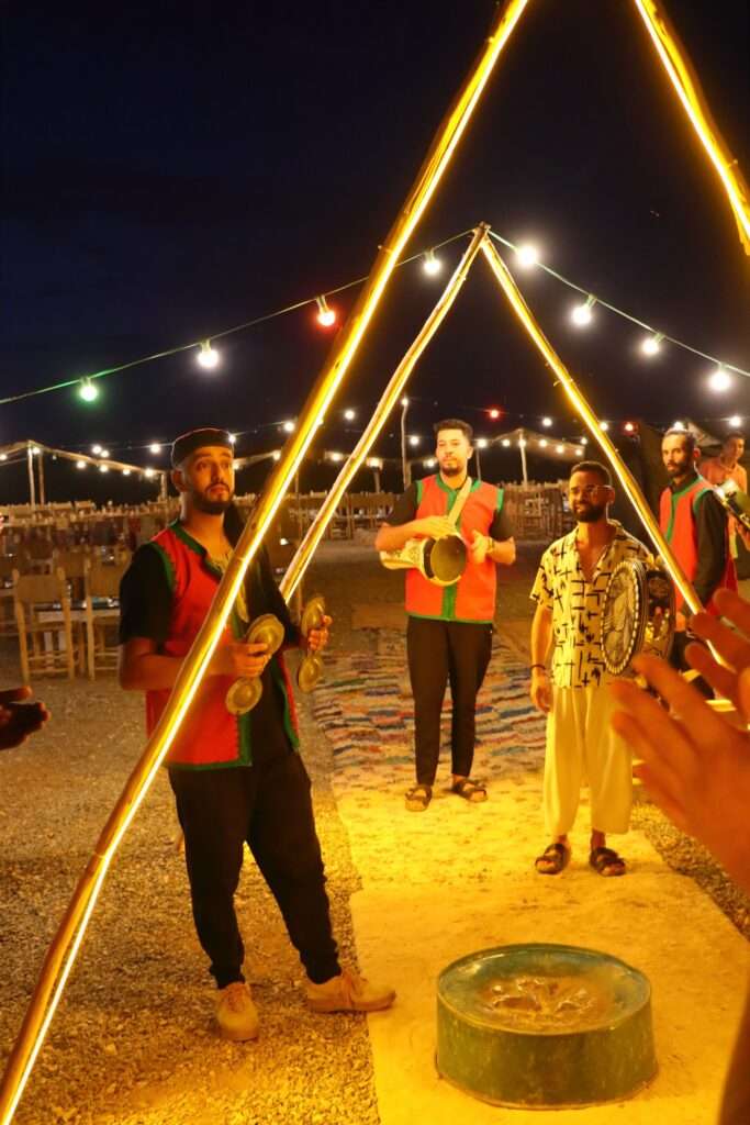 La soirée s’est ensuite animée avec des chants et des danses berbères autour d’un feu de camp. L’énergie des musiciens et des danseurs était contagieuse, et chacun d’entre nous a été invité à participer. Nous avons dansé, chanté et ri ensemble, créant des souvenirs joyeux sous les étoiles. Ce moment de convivialité a ajouté une dimension véritablement immersive à l’expérience, nous rapprochant des traditions locales tout en renforçant le sentiment de communauté.