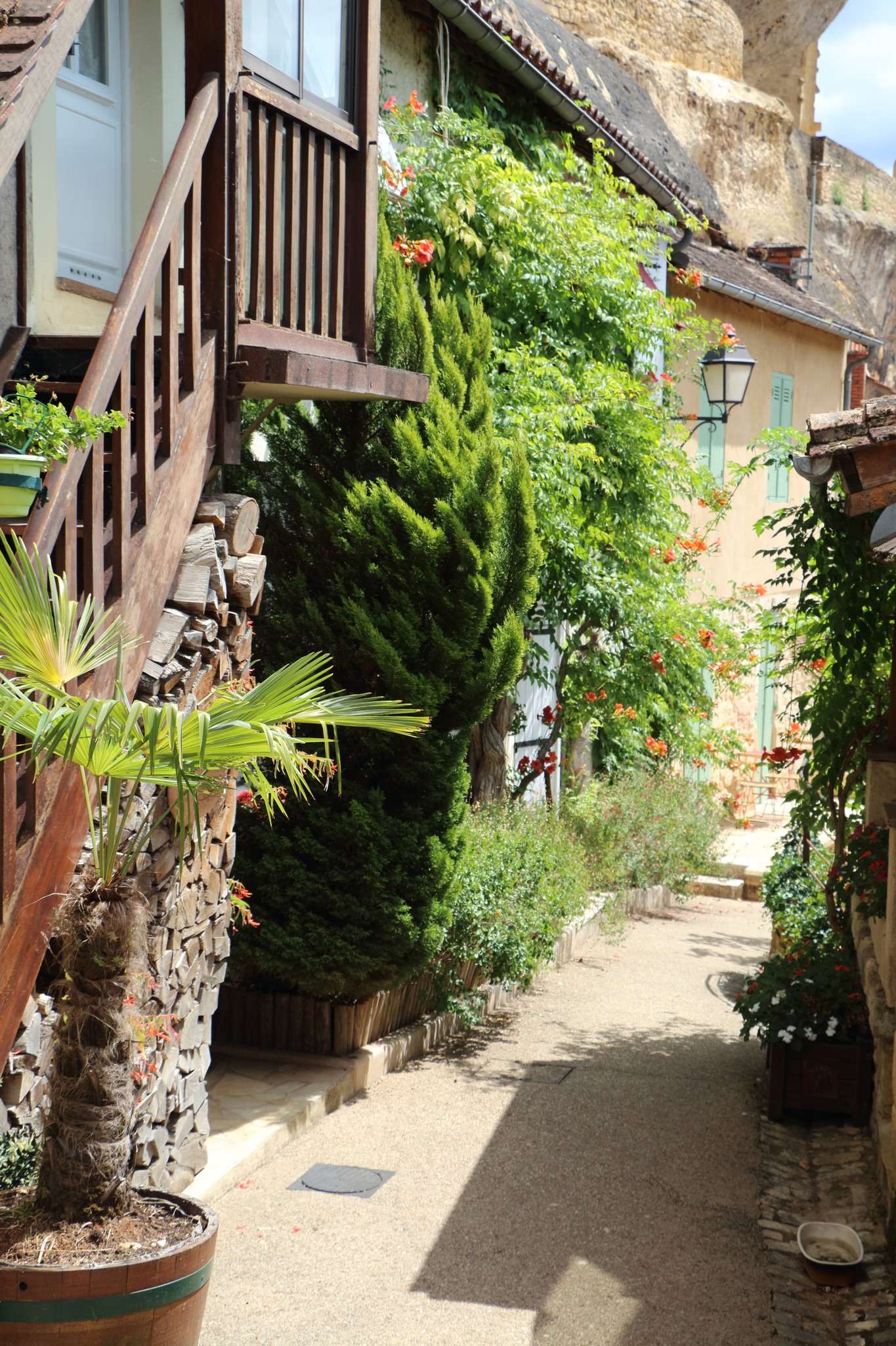 L’architecture locale, elle, ne cherche pas à dominer ce décor : elle s’y fond. Les maisons en pierre calcaire, aux toits pentus et aux volets colorés, s’adossent aux parois rocheuses comme des prolongements du vivant. Certaines bâtisses semblent littéralement incrustées dans la falaise, protégées par les surplombs naturels. Les ruelles étroites serpentent entre les murs fleuris, les escaliers de pierre mènent à des belvédères naturels, et les jardins suspendus s’accrochent aux anfractuosités comme des touches de tendresse.