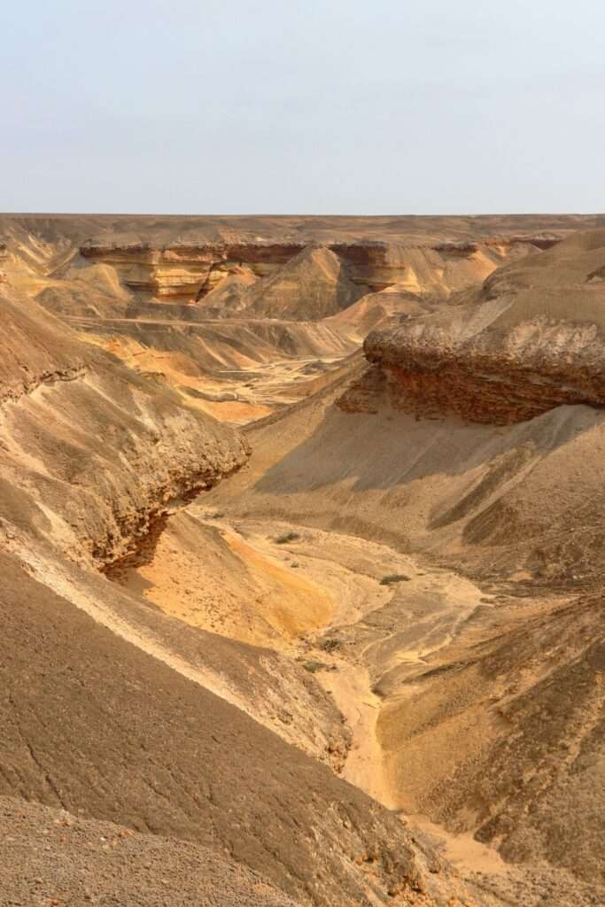Le canyon se révèle soudain, comme une plaie ouverte dans le désert. Des falaises de grès rose et rouge se dressent à pic, entaillées de ravines et de cheminées de fées. Les strates racontent des millénaires d’érosion, les couleurs passent du jaune pâle au rouge carmin selon la lumière. Nous descendons à pied, le sable crissant sous nos pas. Le silence est total, seulement troublé par le souffle du vent. Les parois semblent vibrer de chaleur, et les ombres s’étirent lentement dans le lit du canyon.