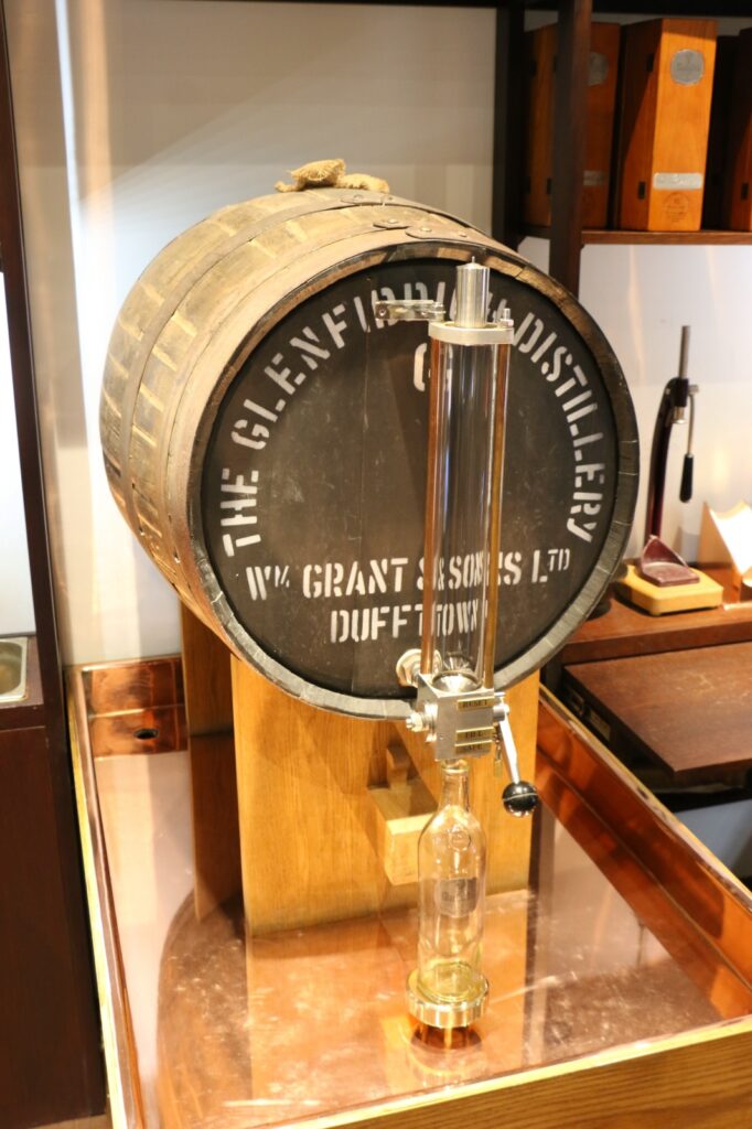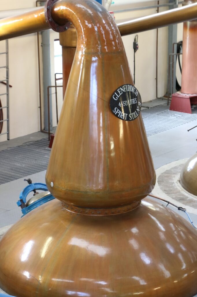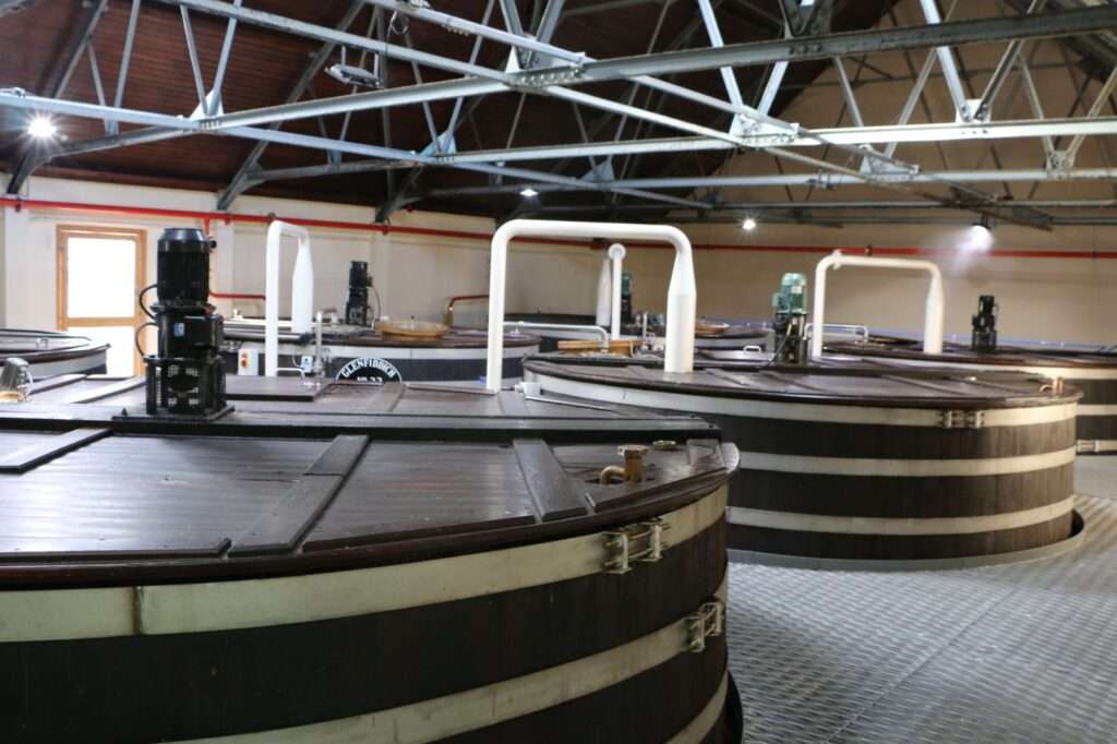 L’architecture du site reflète cette longue histoire. Les bâtiments de pierre aux toits d’ardoise s’étendent le long de la vallée, mêlant structures historiques et installations modernes. Les entrepôts, massifs et silencieux, abritent des milliers de fûts empilés sur plusieurs niveaux, tandis que les washbacks en pin d’Oregon, toujours utilisés, rappellent l’attachement de Glenfiddich aux matériaux traditionnels. Dans la salle des alambics, le cuivre brille sous un éclairage industriel maîtrisé, révélant une impression de puissance contenue. L’ensemble est à la fois fonctionnel, presque industriel par endroits, et profondément ancré dans le paysage.
