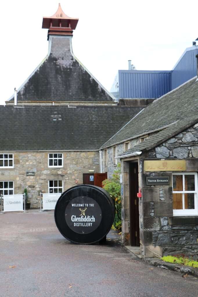 Nous poursuivons notre route à travers les vallées douces et verdoyantes du Speyside, là où la rivière Fiddich serpente entre prairies, forêts de pins et collines tapissées de bruyère. C’est à Dufftown, souvent surnommée la « capitale mondiale du whisky », que se dresse l’une des distilleries les plus emblématiques d’Écosse : Glenfiddich, littéralement la « vallée des cerfs ». Le site respire à la fois l’histoire, la continuité et une étonnante modernité, fruit d’un équilibre rare entre tradition familiale et capacité d’innovation.