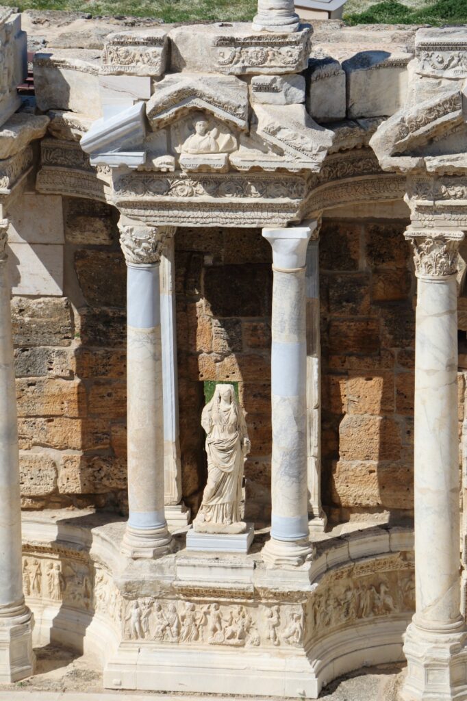 Nous gravissons ses rangées de pierre taillée dans la pente naturelle ; neuf étages de gradins pouvaient accueillir jusqu’à 10 000 spectateurs, assis sur des bancs de marbre dont certains reposaient sur des pieds de lion sculptés . Le scaenae frons, jadis décoré de trois étages de colonnades et de statues d’Apollon et d’Artémis, se dresse encore en silhouette contre le ciel du soir. Les textes anciens rapportent qu’on reconstruisit l’orchestre pour pouvoir l’inonder et y simuler des batailles navales : nous sentons le souffle de la volonté romaine d’allier génie technique et spectacle grandiose . Assis là, nous aurions presque cru entendre les chœurs antiques résonner contre la colline.