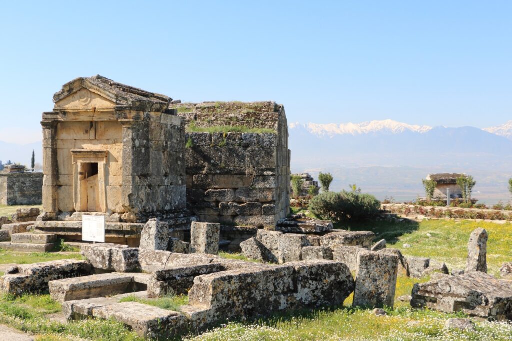 Nous atteignons enfin les nécropoles antiques à l’extrémité nord et est. La lumière déclinante illumine les dizaines de tombeaux alignés : la petite nécropole orientale, plus modeste, contraste avec l’immense nécropole nord. Cette dernière s’étend sur environ deux kilomètres le long de l’ancienne route, avec plus de mille sépultures découvertes à ce jour . Sarcophages familiaux aux toits à double pente, tumulus circulaires, tombeaux pyramidaux : chaque monument reflète l’identité de son occupant, romain, grec ou syro-phrygien. Du haut des marches, nous dominons cette étendue de pierre et de marbre : c’est alors que nous comprenons toute l’ampleur du site. Comme l’écrivent les archéologues, la nécropole d’Hiérapolis « offre un vaste panorama des pratiques funéraires de l’époque gréco-romaine » . Nous quittons la colline avec le sentiment d’avoir frôlé les coutumes d’autrefois : dans le crépuscule, les reliefs et inscriptions gravées dans le marbre racontent encore de multiples légendes familiales et miracles anciens.