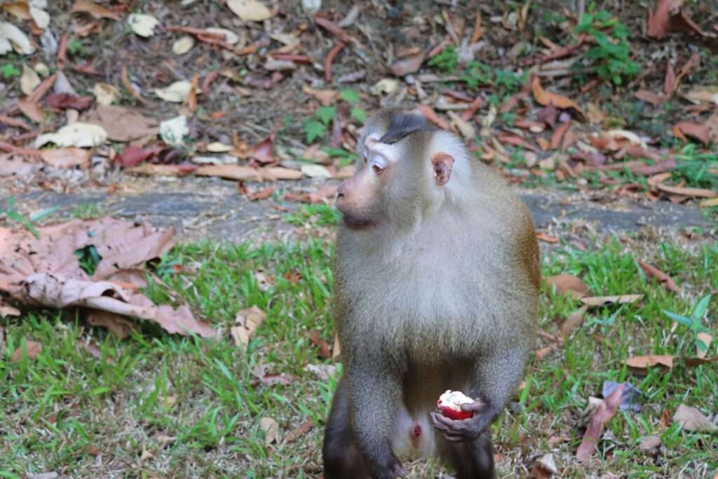 Sur le chemin, la faune se manifeste. Nous croisons un macaque à queue de cochon du Sud (Macaca nemestrina), massif, musclé, reconnaissable à sa courte queue recourbée et à son allure puissante. Il tient un fruit rouge dans la main, l’examine, le goûte, puis disparaît dans les sous‑bois. Cette espèce, plus terrestre que les macaques crabiers, est emblématique des forêts profondes de Khao Yai.