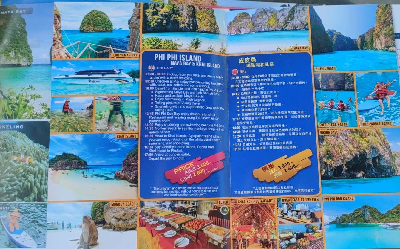 Après avoir pris la direction du port de Chalong, véritable carrefour maritime de Phuket, nous nous sommes renseignés pour réserver nos excursions vers deux incontournables : Ko Phi Phi, avec ses falaises spectaculaires et ses eaux translucides, et la baie de Phang Nga, royaume des pitons calcaires et des lagunes secrètes. L’excitation était bien là… mais la faim nous a vite rattrapés.