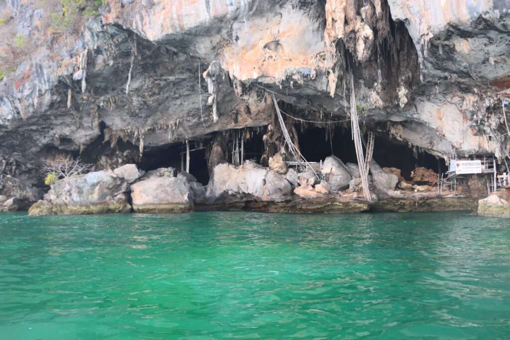 En longeant les falaises abruptes de Ko Phi Phi Leh, nous découvrons une cavité impressionnante : la grotte aux hirondelles. Suspendues au‑dessus des eaux vertes, les parois calcaires se couvrent de stalactites, et des échafaudages de bambou témoignent d’une activité humaine ancienne et toujours vivante. Ici, les habitants récoltent les nids d’hirondelles, prisés depuis des siècles pour leur usage culinaire et médicinal.