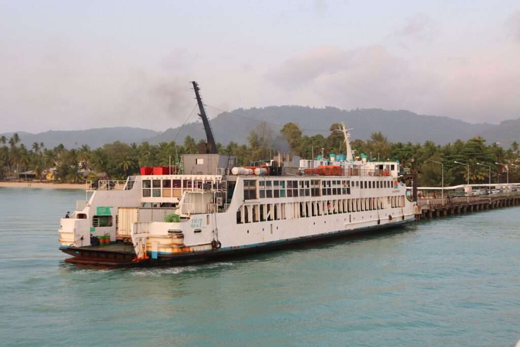 Nous reprenons la route pour deux à trois heures supplémentaires. À mesure que nous approchons de Surat Thani, les reliefs se font plus présents, les cocoteraies plus nombreuses, et l’atmosphère résolument tropicale. La fatigue commence à se faire sentir, mais elle est largement compensée par l’excitation : le port de Donsak n’est plus très loin. Cinq heures et demie à six heures après notre départ, nous atteignons enfin l’embarcadère. L’odeur de la mer, le va-et-vient des ferries, les silhouettes des îles à l’horizon… tout annonce la fin de la route terrestre.