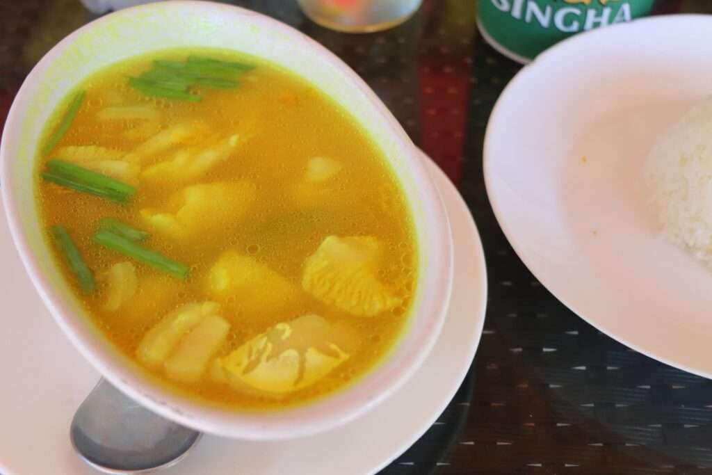 Le déjeuner est servi à bord, sous forme de buffet thaïlandais généreux : riz sauté, curry de légumes, poulet au gingembre, pastèque fraîche… tout est savoureux et réconfortant après les efforts du matin. Le prix du tour (entre 1 100 et 1 800 THB) comprend tout, sauf les 300 THB de droit d’entrée dans le parc, que nous avons réglés à l’embarquement.