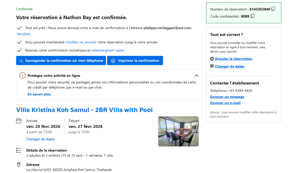 La déception est immense, presque absurde après tant de kilomètres. Heureusement, Booking réagit immédiatement et prend en charge la situation. Nous passerons finalement la nuit à l’hôtel Varanda, directement sur la plage de Lamai, avant de retrouver demain une nouvelle villa — avec piscine, cette fois pour de bon.