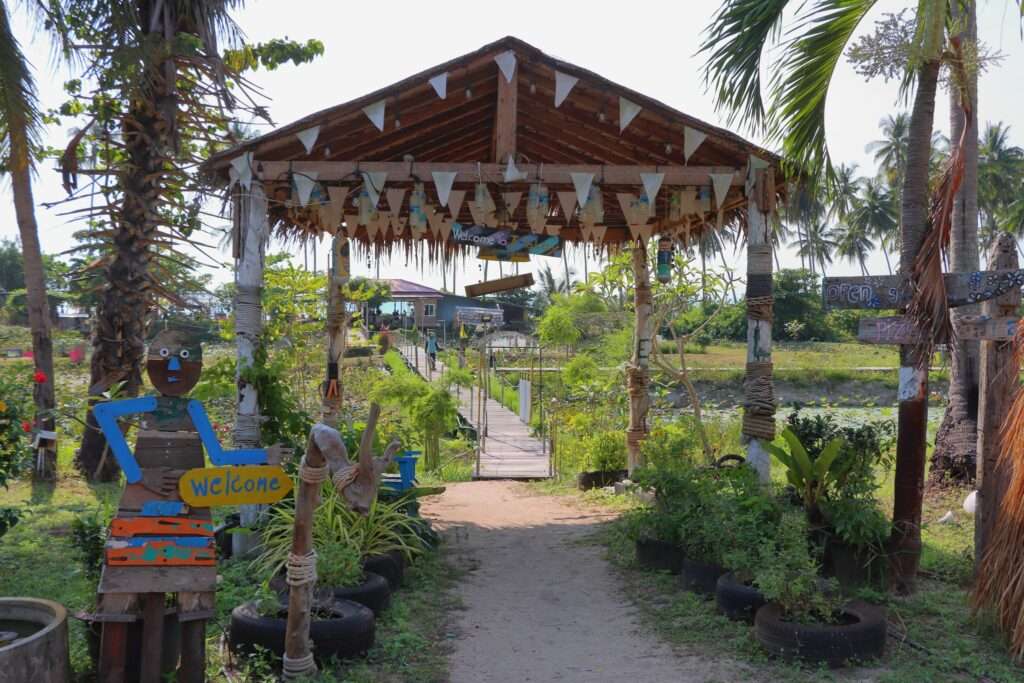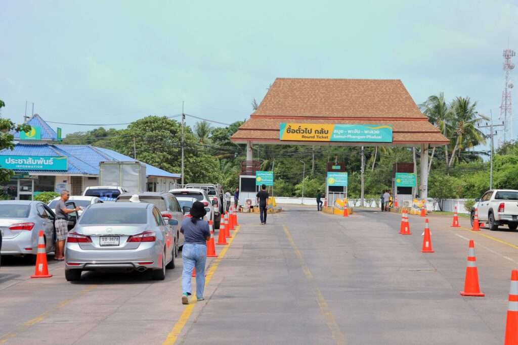 Nous reprenons la route pour deux à trois heures supplémentaires. À mesure que nous approchons de Surat Thani, les reliefs se font plus présents, les cocoteraies plus nombreuses, et l’atmosphère résolument tropicale. La fatigue commence à se faire sentir, mais elle est largement compensée par l’excitation : le port de Donsak n’est plus très loin. Cinq heures et demie à six heures après notre départ, nous atteignons enfin l’embarcadère. L’odeur de la mer, le va-et-vient des ferries, les silhouettes des îles à l’horizon… tout annonce la fin de la route terrestre.