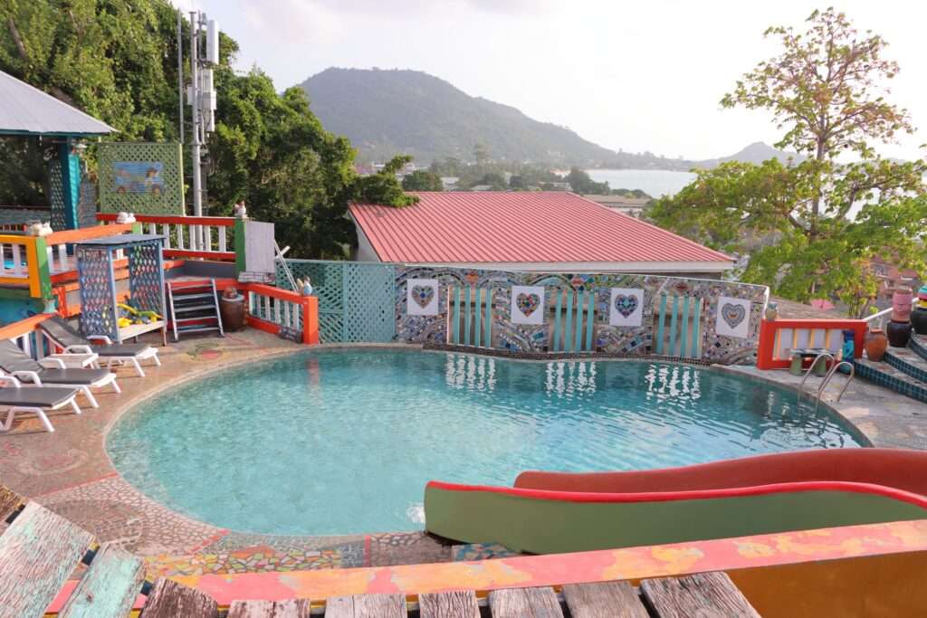 La piscine, perchée avec vue sur les collines et la mer au loin, est l’un des atouts du lieu. Colorée, entourée de mosaïques et de structures originales, elle donne l’impression d’un refuge créatif au cœur de la nature. Le petit déjeuner, quant à lui, est copieux et varié, parfait pour commencer la journée avant de reprendre notre route vers notre future villa.