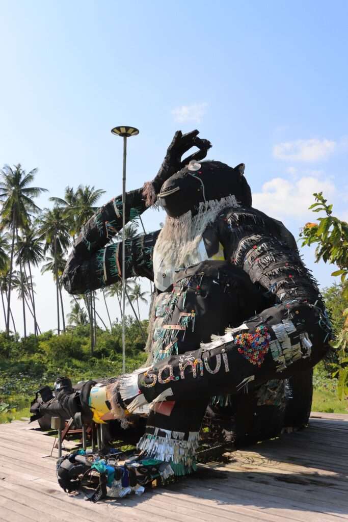 En quittant les cascades de Na Muang pour rejoindre le Giant Summit Samui, la route s’élève en lacets serrés à travers la jungle. Les cocotiers et les bananiers bordent les pentes abruptes, la végétation semble vouloir reprendre ses droits, et à mesure que l’on grimpe, l’air se rafraîchit, la lumière s’adoucit. L’île dévoile alors ses reliefs secrets, comme si chaque virage ouvrait une nouvelle page de son paysage.