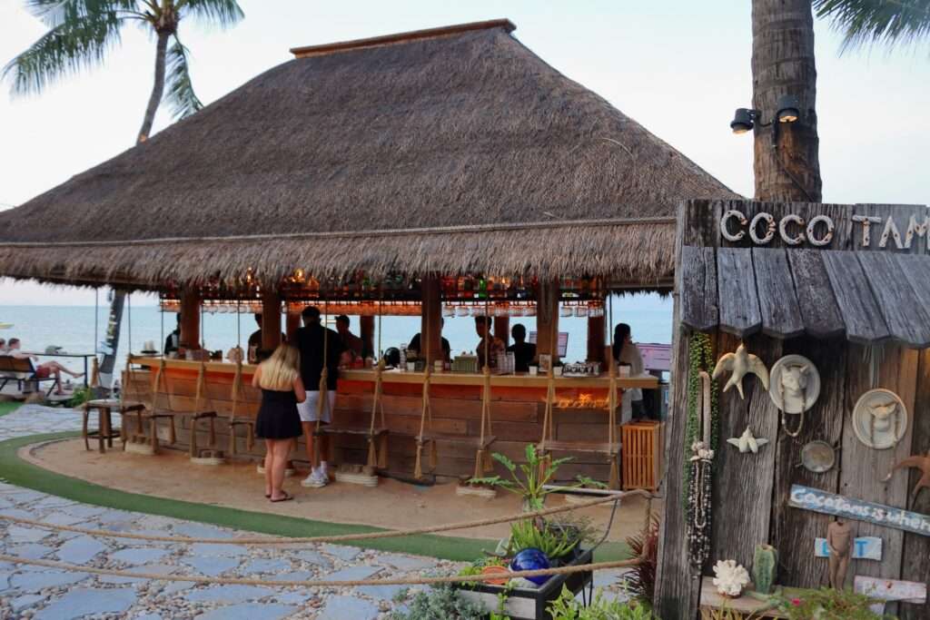 On arrive souvent avec l’idée d’un simple verre. On reste parce que l’endroit sait capter le temps. Pour accéder aux places convoitées — sur la plage ou sur la terrasse — il faut compter un minimum de 500 bahts. Une formalité, presque, au regard de ce que Coco Tam’s propose ensuite. Une fois installé, les pieds dans le sable ou légèrement en hauteur, tout s’aligne : la mer noire en toile de fond, les lumières basses, les coussins posés sans ostentation, et cette impression immédiate d’être exactement là où il faut être.