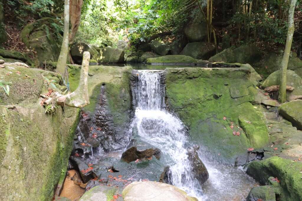 Une plateforme s’avance sur la forêt et offre une vue saisissante sur la canopée. Le regard plonge dans un océan de verdure, où les palmiers et les bananiers s’entrelacent avec les troncs massifs des arbres tropicaux. À quelques pas, un petit sentier de cent mètres s’enfonce dans la végétation. L’air se charge d’humidité, les racines s’entrelacent sous nos pieds, et soudain apparaît un bassin discret, alimenté par une cascade minuscule qui glisse sur les roches.