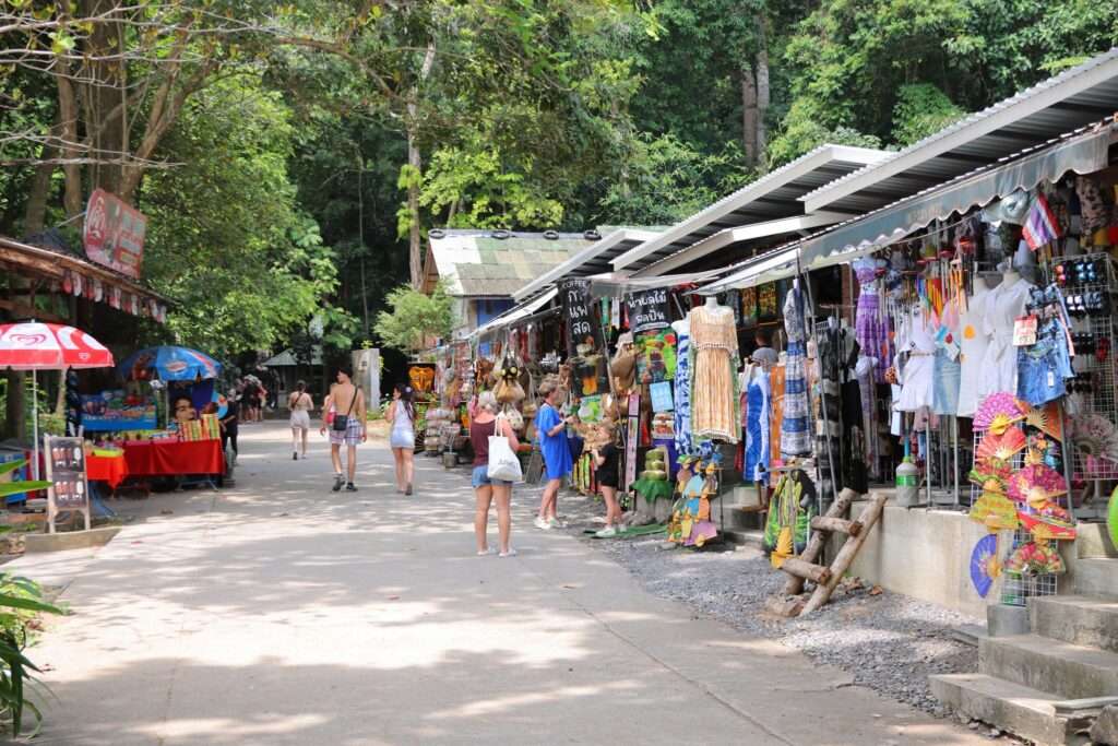 Nous y allons en fin de journée, lorsque la lumière commence à se faire plus douce et que la chaleur, sans disparaître, devient enfin supportable. Au pied du site, une petite vie commerçante s’est organisée : des échoppes de vêtements légers aux couleurs tropicales, des étals de souvenirs, des statuettes de Bouddha, des bracelets porte-bonheur, des encens et de petits objets d’art. Les vendeurs interpellent doucement les visiteurs, les clochettes tintent, et l’odeur sucrée des brochettes grillées flotte dans l’air. Ce contraste entre ferveur spirituelle et animation touristique fait partie du paysage thaïlandais : le sacré et le quotidien s’y côtoient sans se heurter.