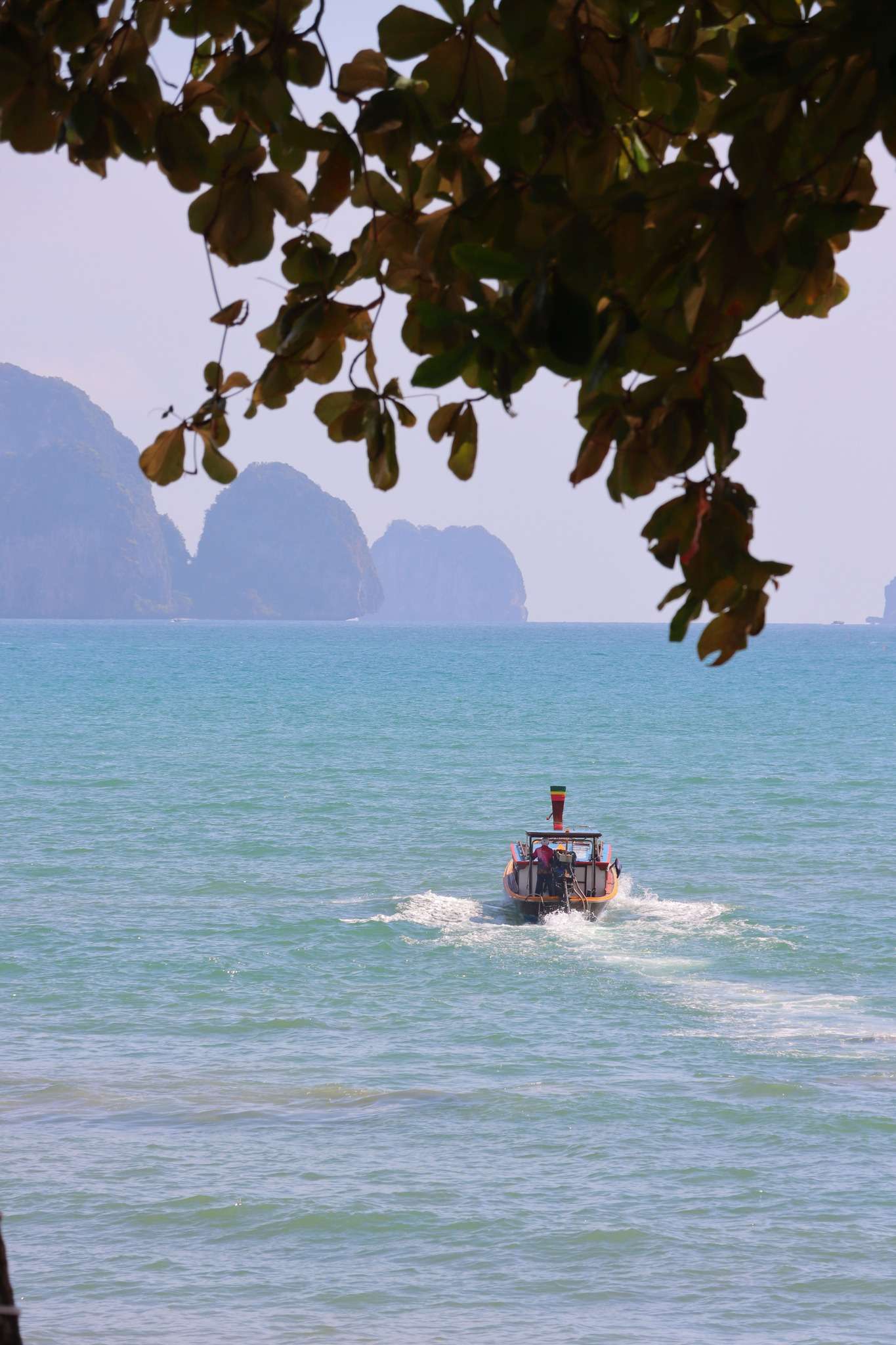 Ao Nang**, le décor change instantanément. La baie s’ouvre devant nous comme un amphithéâtre naturel : une eau turquoise qui accroche la lumière, des rochers abrupts qui surgissent de la mer comme des sculptures géantes, et les silhouettes élancées des long‑tail boats qui glissent d’un îlot à l’autre. Le paysage a ce charme spectaculaire propre à la région : un mélange de douceur tropicale et de verticalité minérale qui donne l’impression d’entrer dans une carte postale vivante.