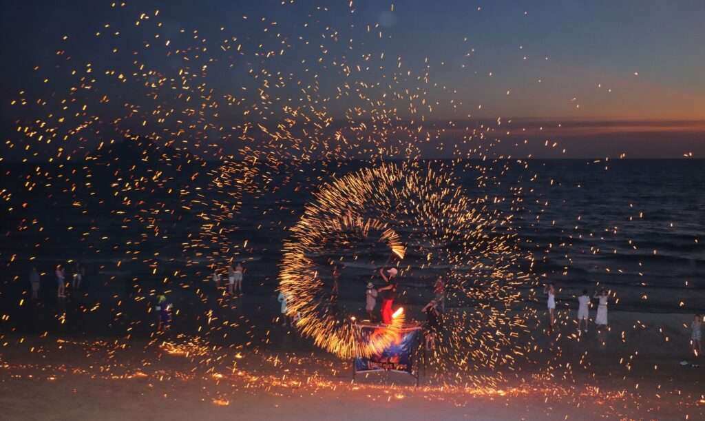 Puis la nuit s’est installée, et la plage s’est transformée en scène vivante. Les artistes locaux ont allumé leurs torches et commencé leur ballet de feu. Les cercles incandescents se dessinaient dans l’air, les étincelles jaillissaient comme des étoiles fugaces, et les applaudissements ponctuaient chaque figure. Entre acrobaties et jongleries, le sable devenait piste de spectacle, et la mer, décor vibrant.