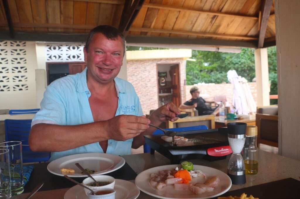 Dès que nous avons franchi le seuil, l’odeur alléchante des fruits de mer frais nous a enveloppés. Le menu, riche et varié, mettait en avant des plats locaux préparés avec des ingrédients frais et savoureux. Nous avons opté pour une pierrade de la mer composée de langouste, gambas, calmar et mérou. Chaque bouchée était un délice, sublimée par une cuisson parfaite et des assaisonnements bien équilibrés.