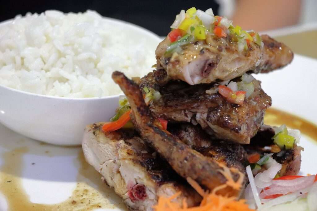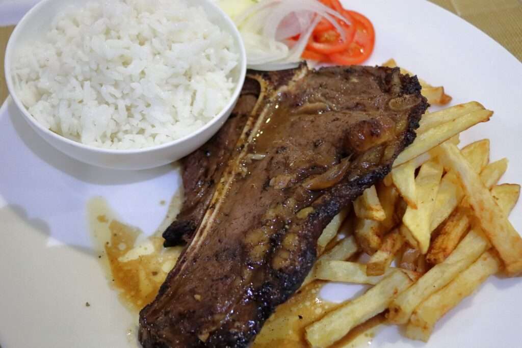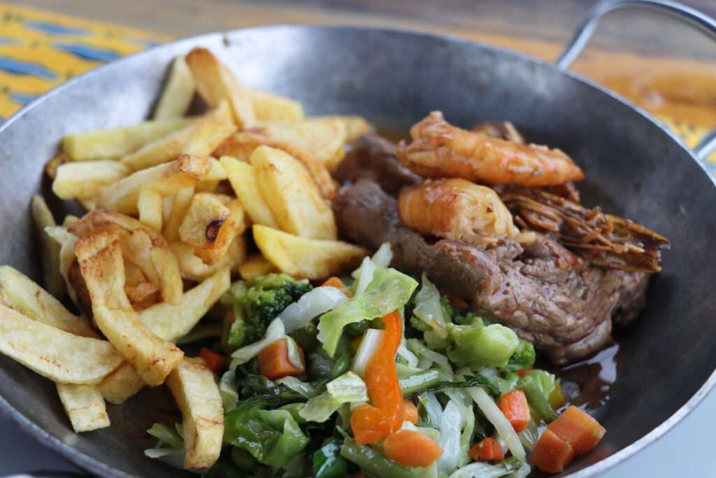 La carte, en revanche, se révèle assez restreinte. On y retrouve les grands classiques de la cuisine portugaise revisités à la mode locale : le bitoque à la portuguesa, copieux steak accompagné d’un œuf au plat, de riz et de frites, se décline parfois en version sucrée-salée avec ananas, sous le nom de bife à la Chimbidja. Le T-bone, généreux, arrive souvent un peu trop cuit, tandis que les massa carbonara (pâtes à la crème et au jambon fumé) s’éloignent de la recette italienne mais rassasient.