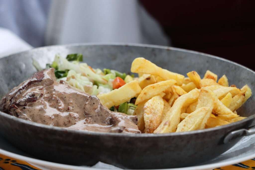 Quant à moi, je choisis le plat du jour : Bife à la Panela. Il s’agit d’un ragoût de bœuf mijoté longuement en cocotte, dans une sauce brune parfumée aux oignons, ail, poivre noir et parfois un soupçon de vin rouge. La viande est fondante, imprégnée de saveurs profondes, servie avec riz blanc, frites maison, et une salade fraîche. Ce plat, typique des cuisines de terroir, évoque les repas familiaux du dimanche, où le temps de cuisson devient un ingrédient à part entière.