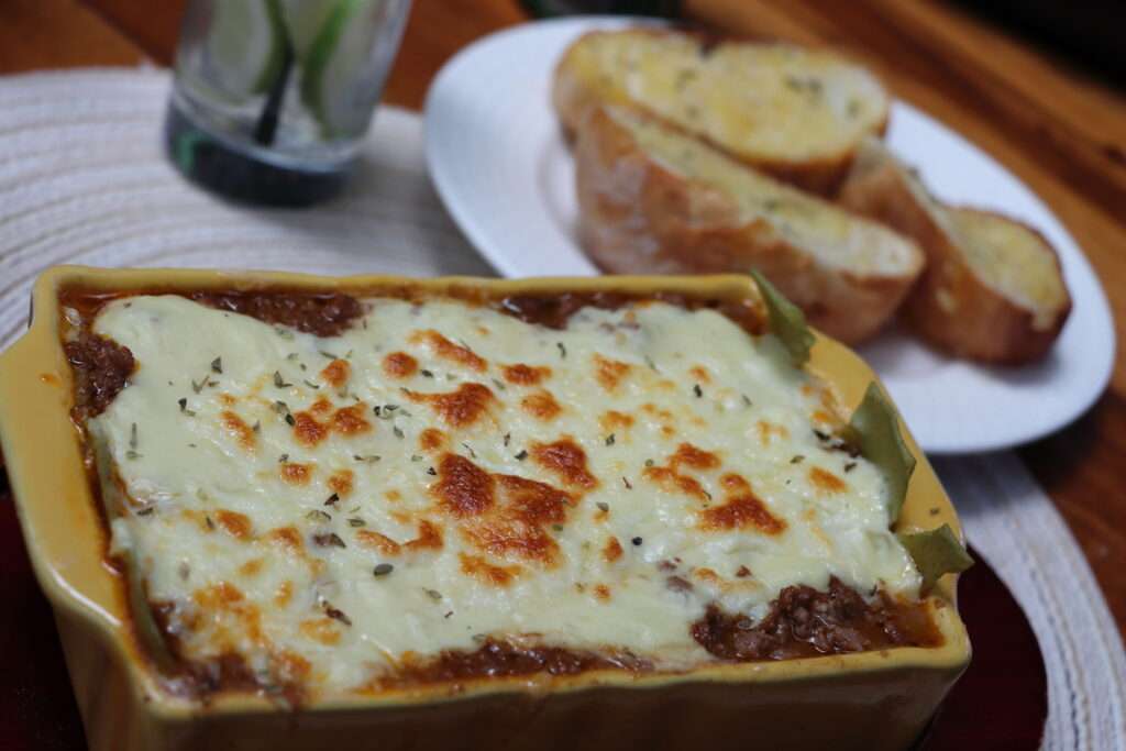 Margot choisit une lasagne gratinée, servie dans son plat en céramique jaune, avec une croûte dorée et des couches bien définies de viande, sauce tomate et béchamel. Le tout est accompagné de tranches de pain à l’ail, toastées et parfumées aux herbes. Nadège, quant à elle, préfère une escalope viennoisemilanesa de frango — fine, croustillante, servie avec des spaghettis à l’huile d’olive et aux herbes fraîches, dans une assiette sobre et élégante.